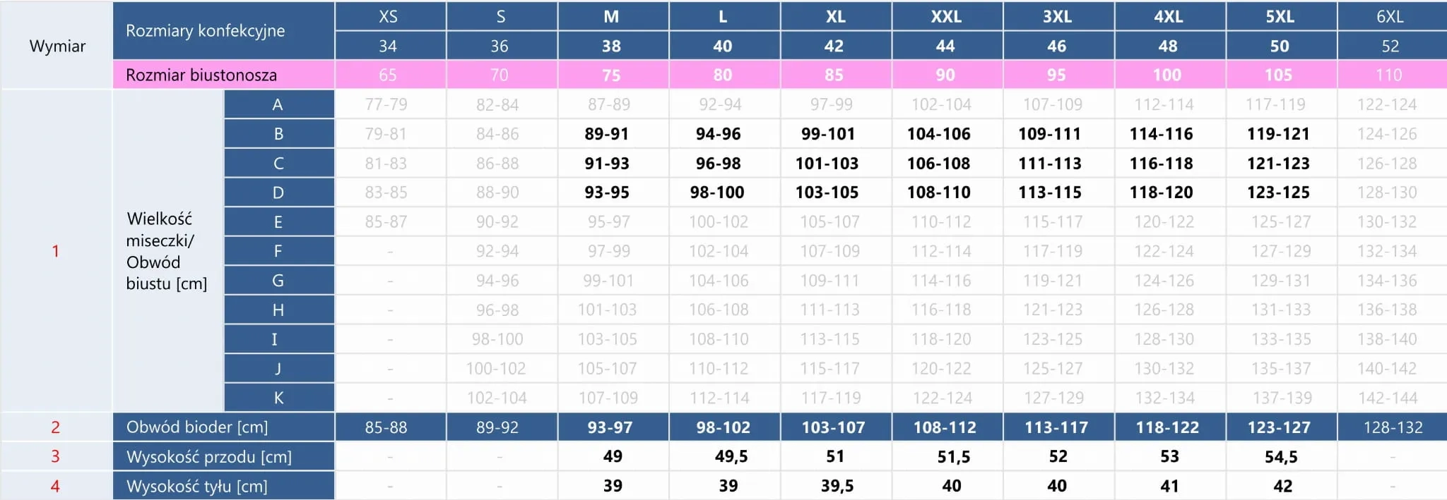 - idealne dopasowanie - dostępny jest w szerokim zakresie rozmiarów, od M/38 do 5XL/50, co sprawia, że każda kobieta znajdzie rozmiar dla siebie