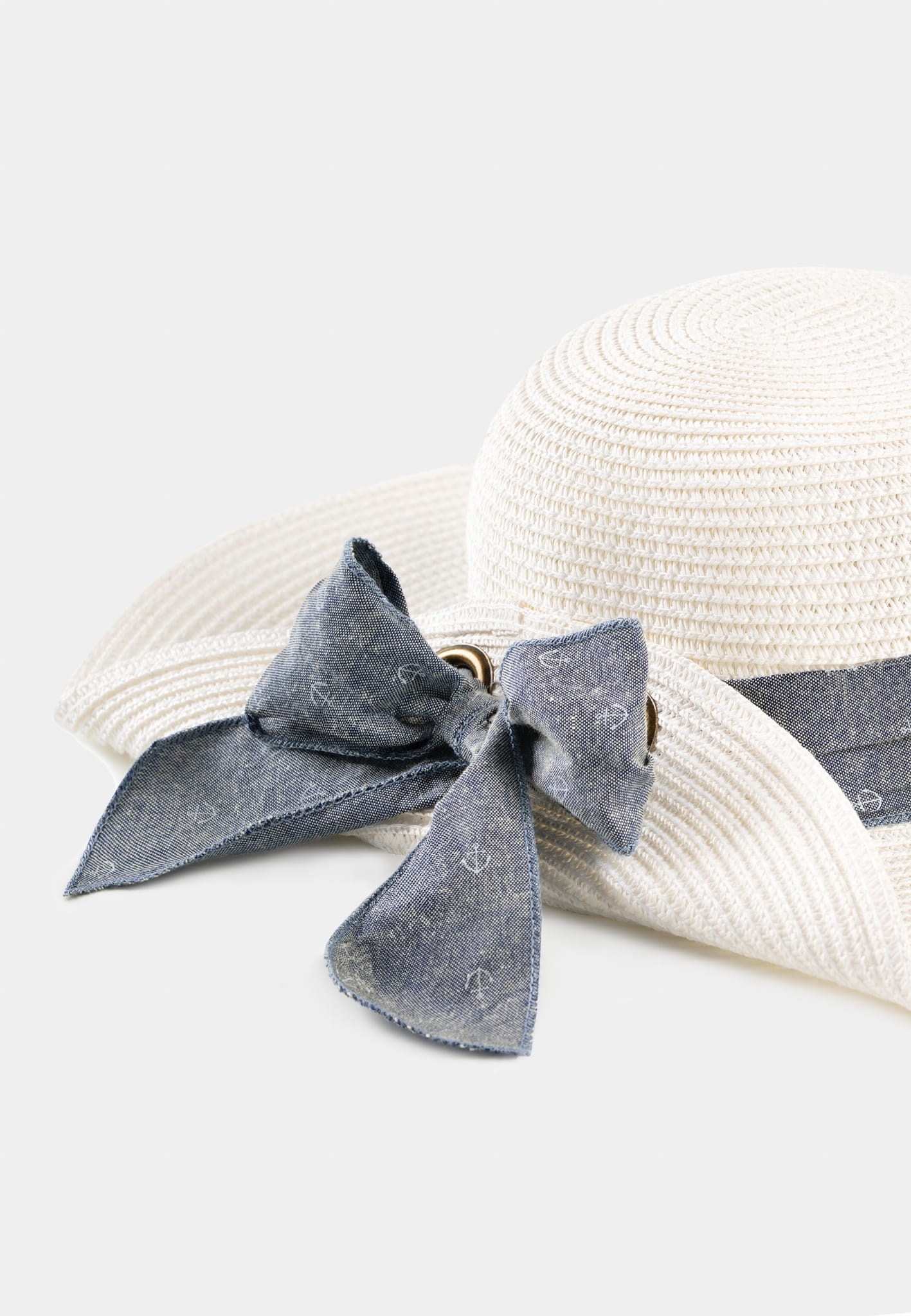 Jego ozdobą jest szeroka granatowa taśma wokół korony, zakończona efektowną kokardą z marynistycznym nadrukiem, która przyciąga spojrzenia i dodaje eleganckiego charakteru całej stylizacji. Dodatkowo asymetryczny kształt ronda, delikatnie zagięty z jednej strony, sprawia, że kapelusz prezentuje się lekko, kobieco i z klasą. To nakrycie głowy, które nie tylko osłania twarz przed szkodliwym promieniowaniem UV, ale też pozwala poczuć się wyjątkowo stylowo – niezależnie od okazji.
