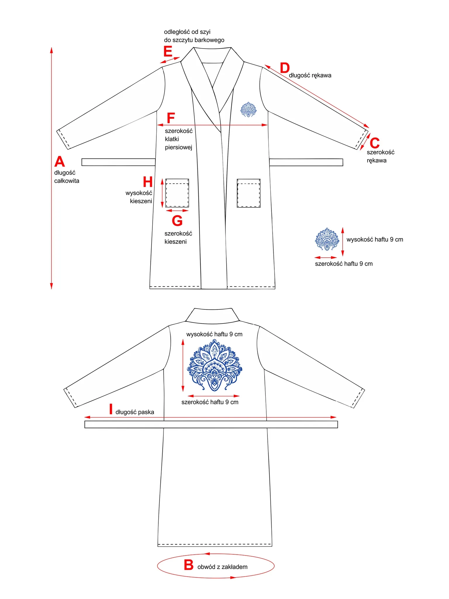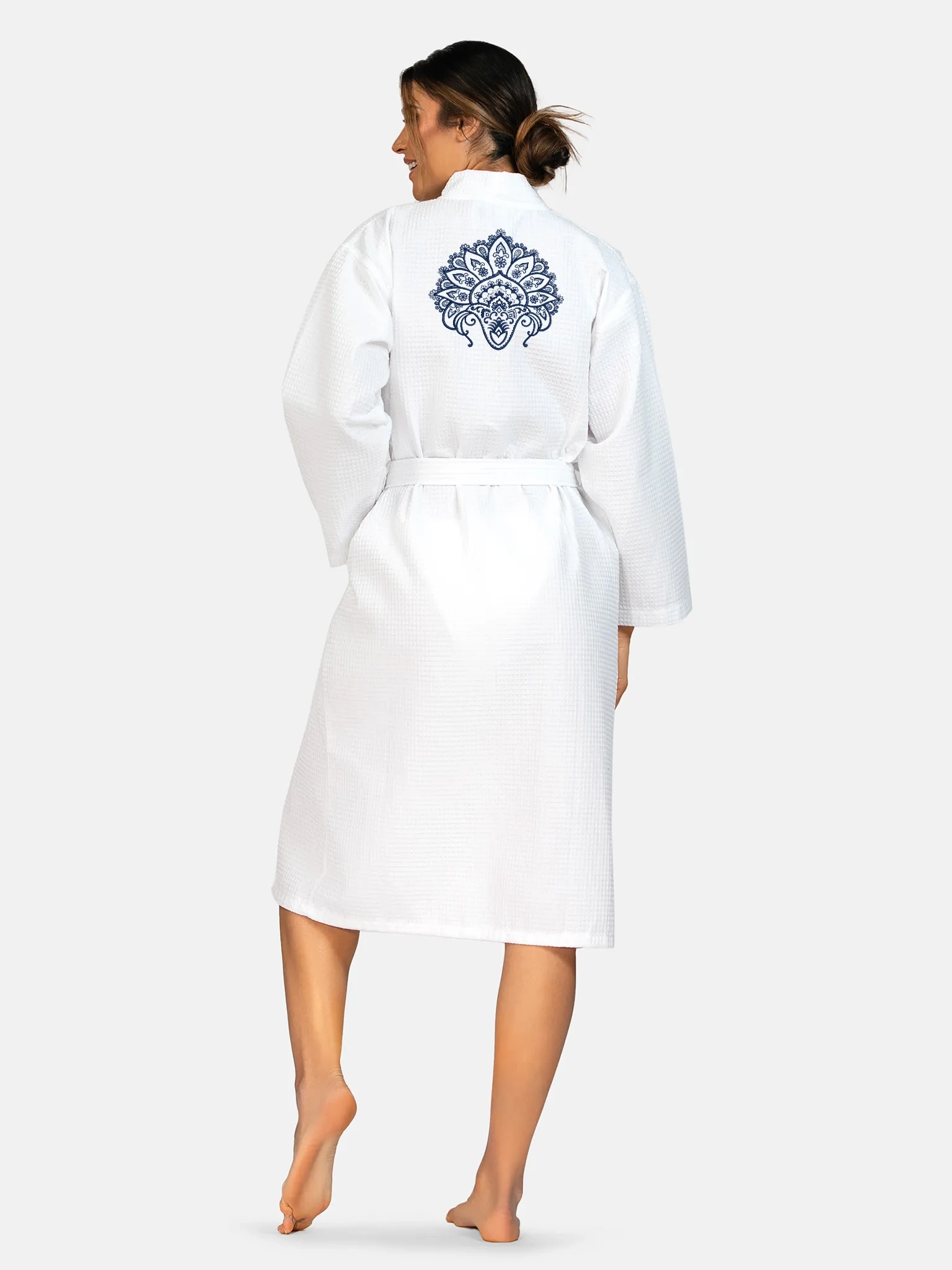 - Fason: klasyczne kimono z kieszeniami, długość za kolano – uniwersalny krój ceniony w hotelach i SPA.