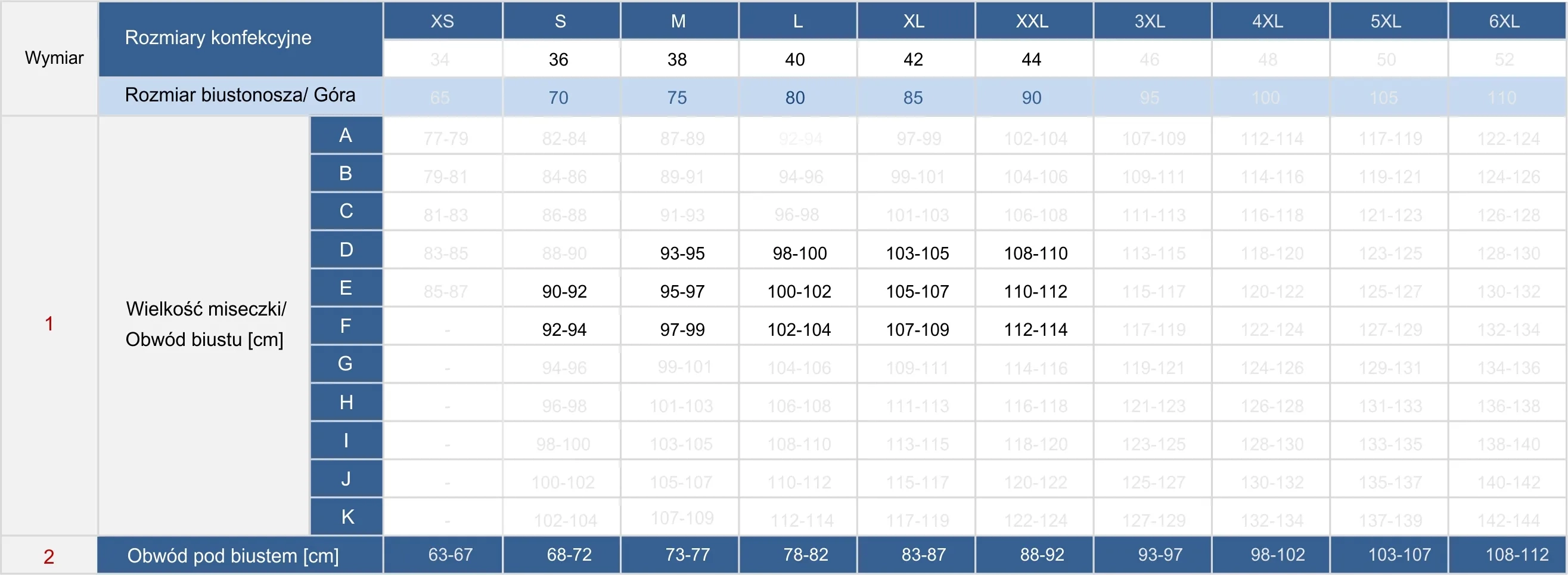 - Rozmiary: 36EF, 38DEF, 40DEF, 42DEF, 44DEF