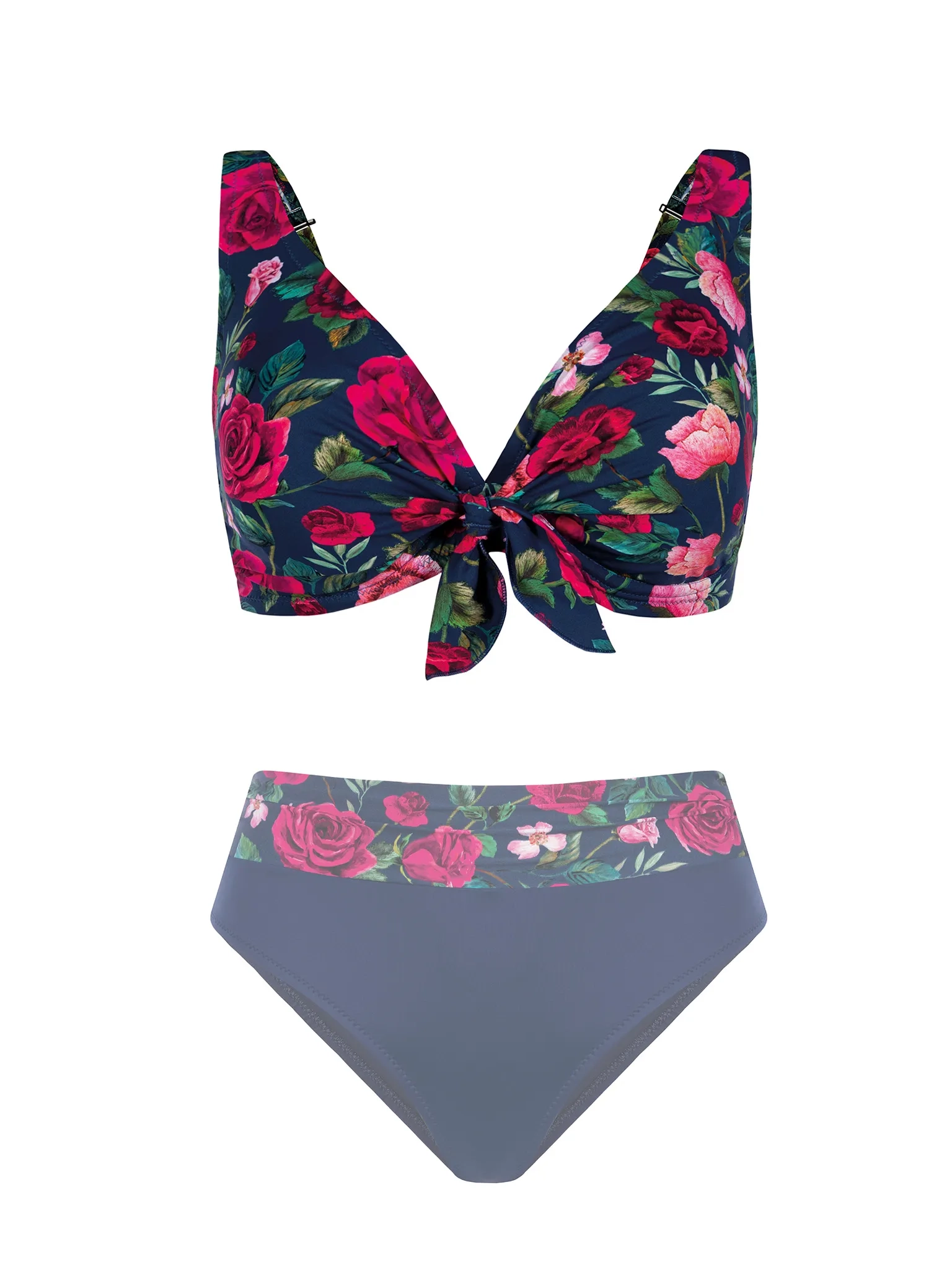 Biustonosz ten tworzy idealny komplet z figami z tej samej linii - np. klasycznym modelem lub z różanym pasem w talii. Granatowo-różowy motyw pięknie wygląda również w połączeniu z gładkimi dołami w kolorze granatowym - dla spokojniejszej, bardziej eleganckiej stylizacji, fuksjowym lub malinowym - jeśli chcesz wzmocnić efekt koloru, ciemnozielonym - jako mniej oczywisty, ale bardzo szykowny duet.