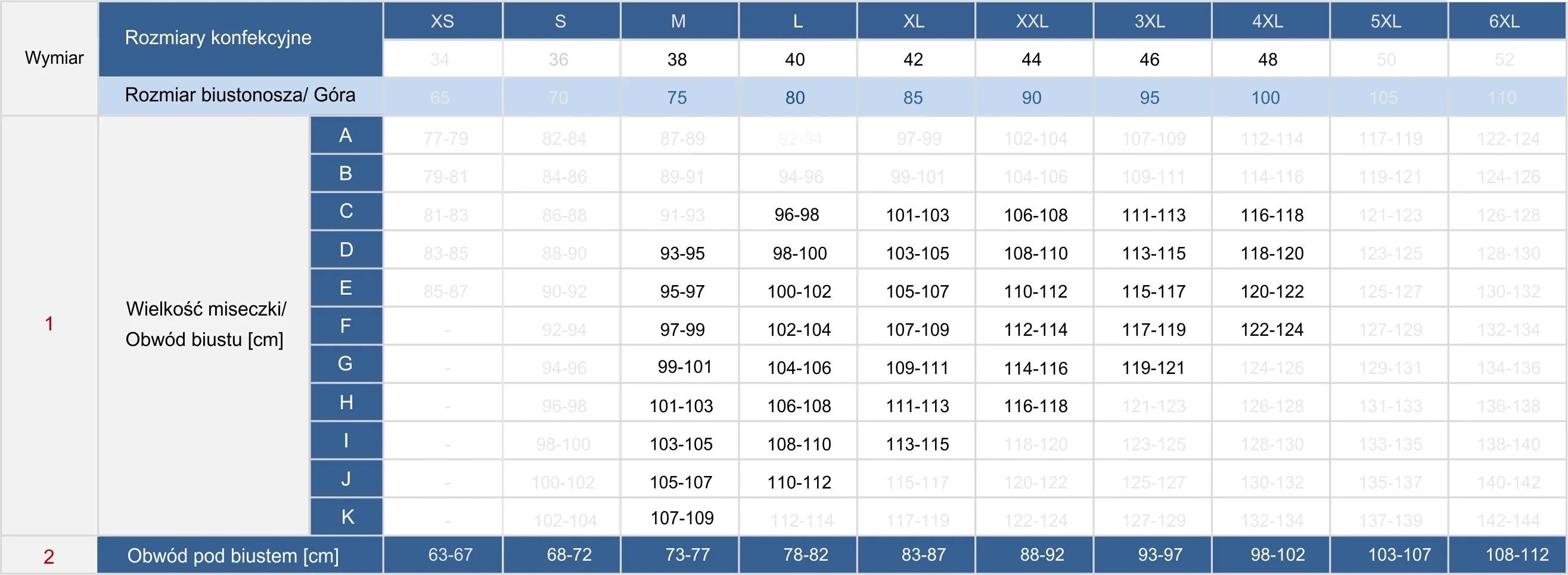 - Rozmiary: 38DEFGHIJK, 40CDEFGHIJ, 42CDEFGHI, 44CDEFGH, 46CDEFG, 48CDEF