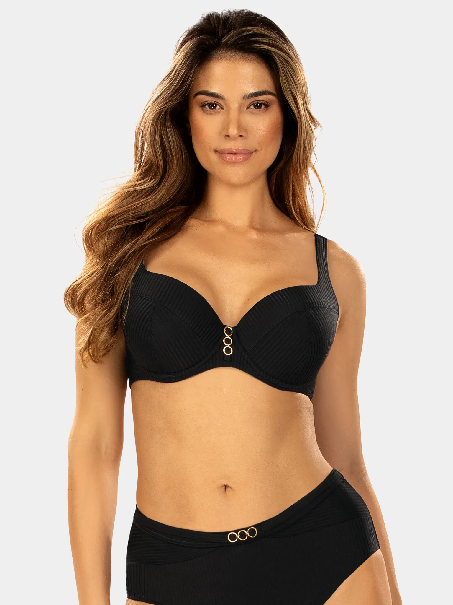Wykonany z wysokiej jakości prążkowanej tkaniny w klasycznej czerni, biustonosz FG04E/807 podkreśla kobiecą sylwetkę i zapewnia stabilność nawet przy większych rozmiarach biustu. Złote detale na środku dodają elegancji, a szerokie, regulowane ramiączka zapewniają idealne dopasowanie i wsparcie bez uczucia dyskomfortu. Konstrukcja z fiszbinami i lekko usztywnianymi miseczkami z pianki gwarantuje, że biustonosz doskonale ukształtuje i podtrzyma biust, co jest niezwykle ważne dla kobiet z większymi miseczkami.