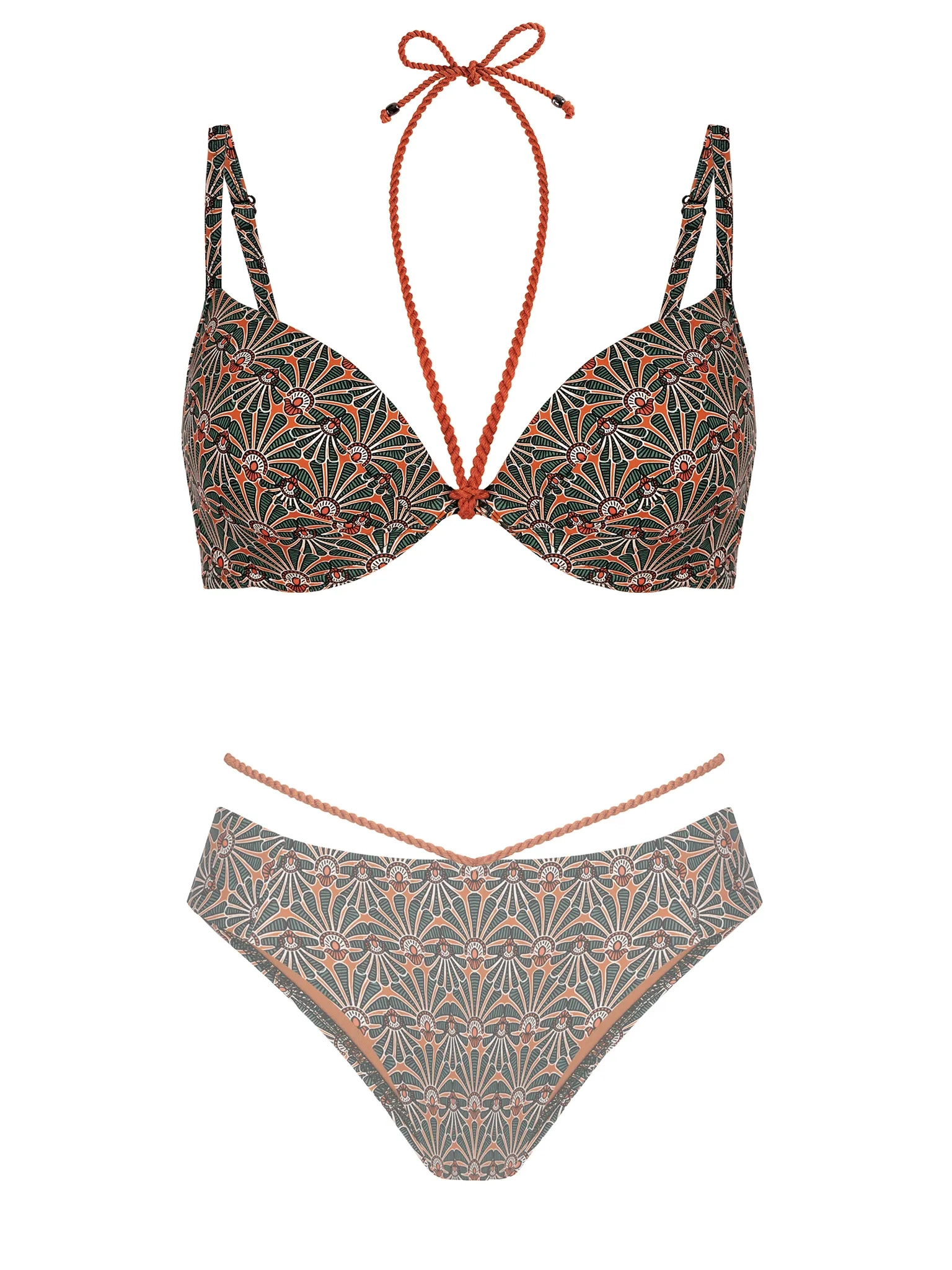 Ta góra od stroju kąpielowego to stanik plażowy typu push-up stworzony z myślą o mniejszym i średnim biuście. Usztywniane miseczki z fiszbiną i wyjmowane wkładki unoszą i optycznie powiększają piersi, a cienkie ramiączka, wąskie łączenie miseczek z przodu i smukły tył sprawiają, że fason jest lekki i nie przytłacza sylwetki. Na środku znajduje się pleciony sznurek-łańcuszek w odcieniu rdzawej pomarańczy, który można odwiązać - nosisz go jako ozdobę dekoltu lub rezygnujesz z biżuteryjnego efektu. Ramiączka są regulowane i odpinane z tyłu, więc możesz nosić je klasycznie lub wiązać na szyi, a całość dopełnia zapięcie z logowaną klamerką Feba.