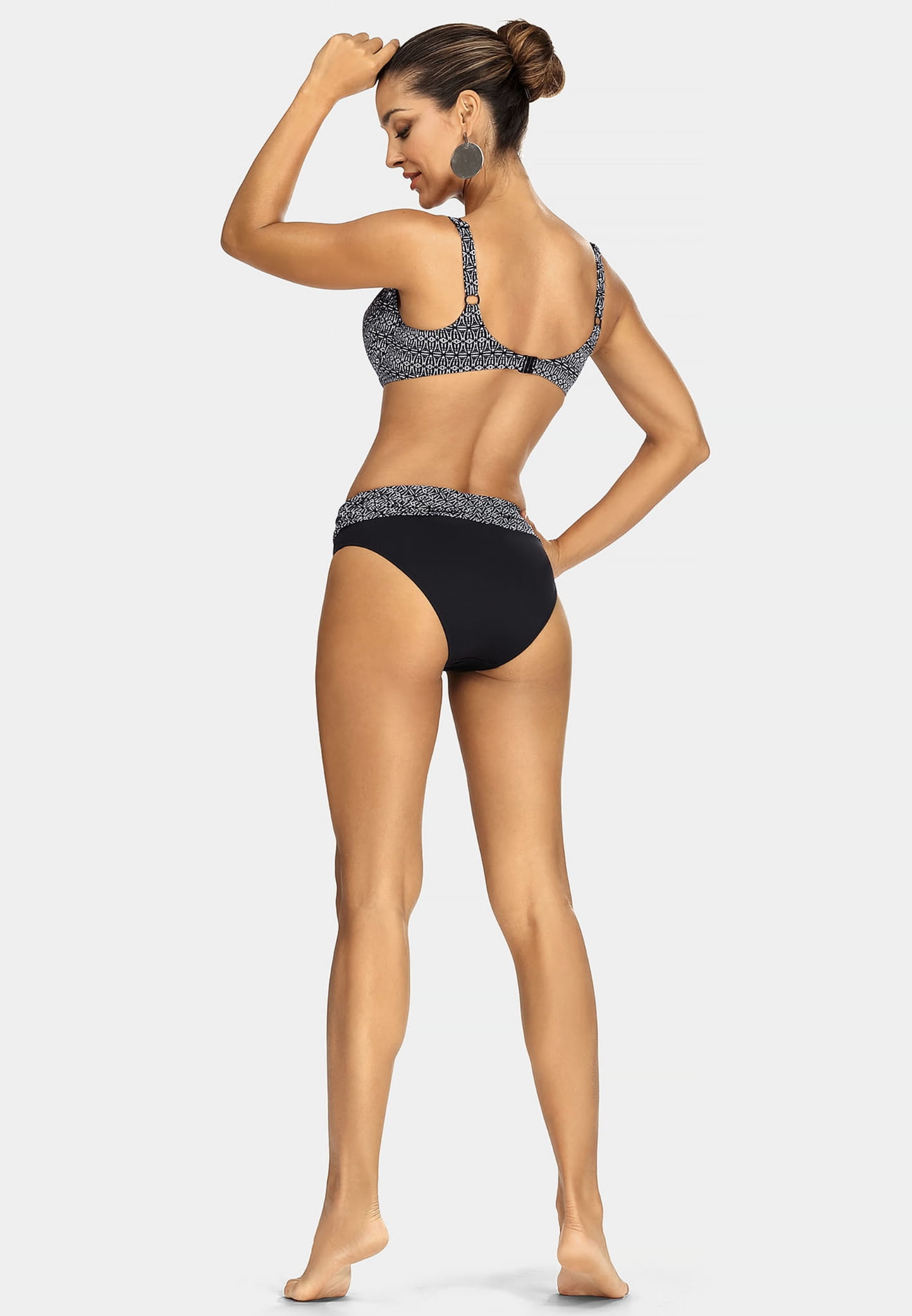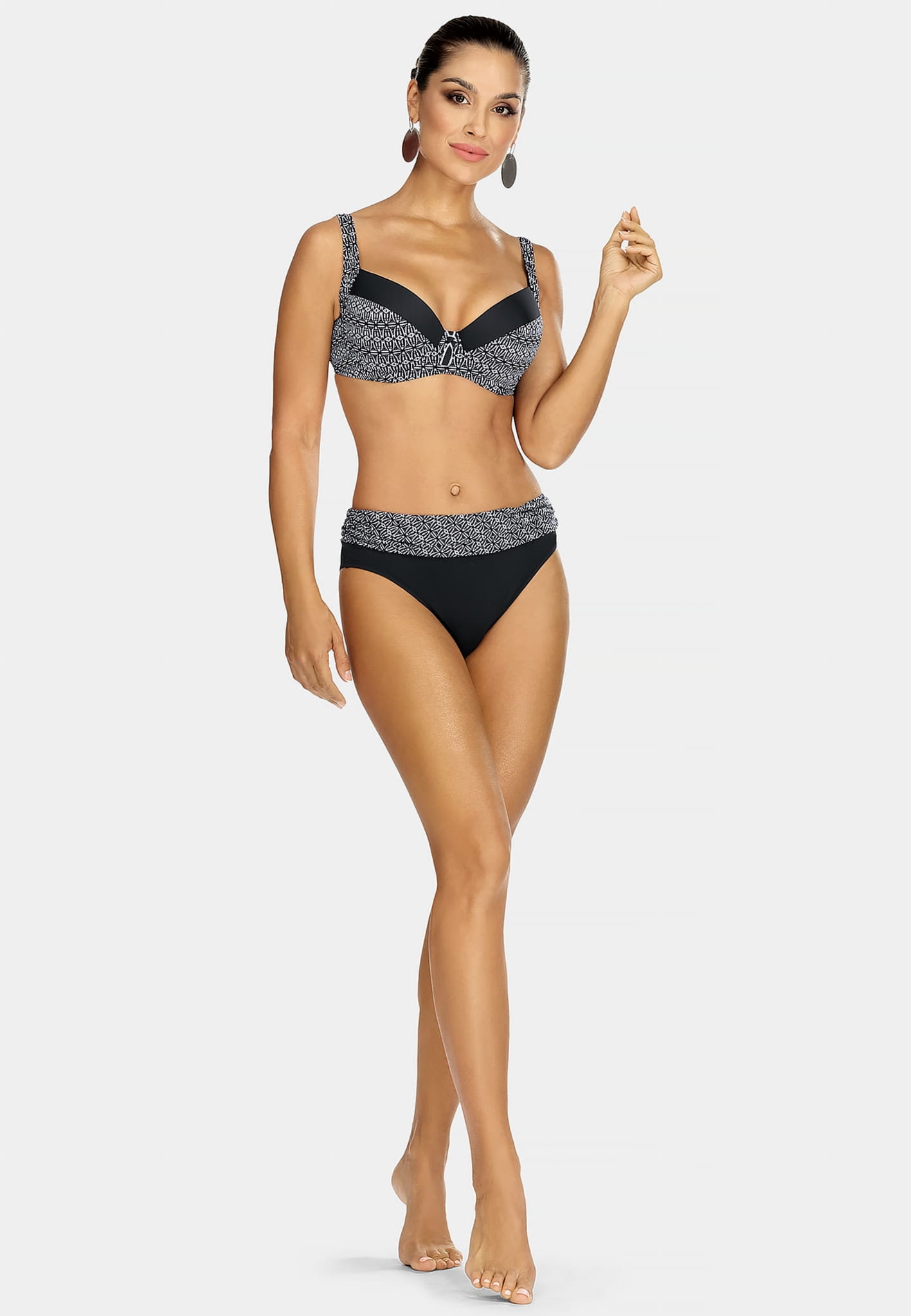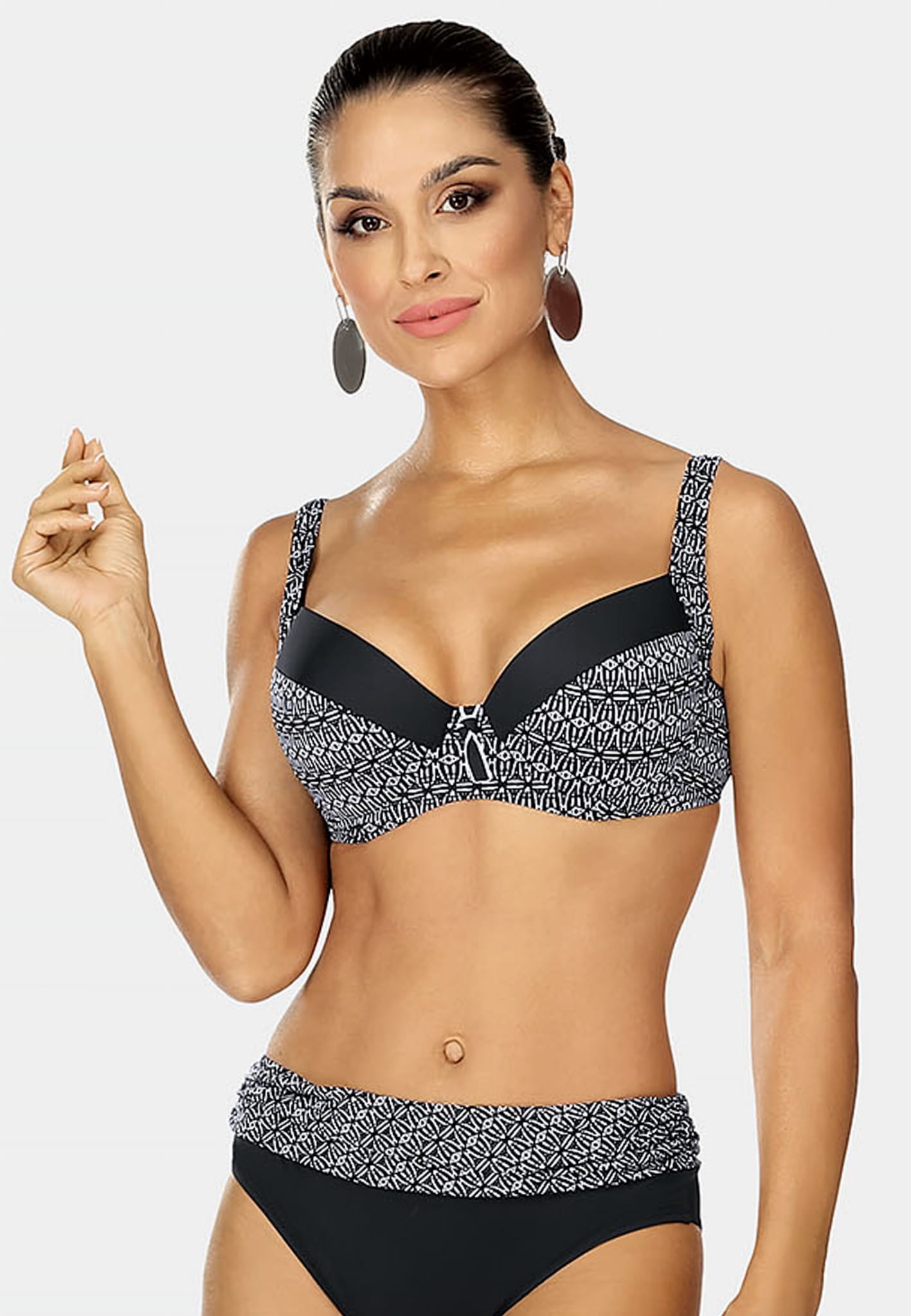 Biustonosz kąpielowy FG91/823 został wykonany z materiału w białe, geometryczne, azteckie wzory na czarnym tle. To idealna propozycja dla kobiet lubiących wyważony, stonowany styl. Fason biustonosza dedykowany Paniom z dużym rozmiarem piersi (występuje aż do rozmiaru K), który z pewnością zapewni doskonały komfort podczas noszenia. Góra od stroju kąpielowego posiada fiszbiny oraz miseczkę poprzecznię ciętą, wykonaną z przyjemnej pianki, przez co całość idealnie trzyma i kształtuje biust. Model na szerokich, regulowanych, nieodpinanych ramiączkach. Boczki podszyte wzmacniającą, stabilizującą obwód siateczką. Tył zapinany na praktyczny zatrzask (bez niklu). Górna część miseczek została wykończona czarnym materiałem, który dodatkowo podkreśla dekolt oraz elegancki fason biustonosza.