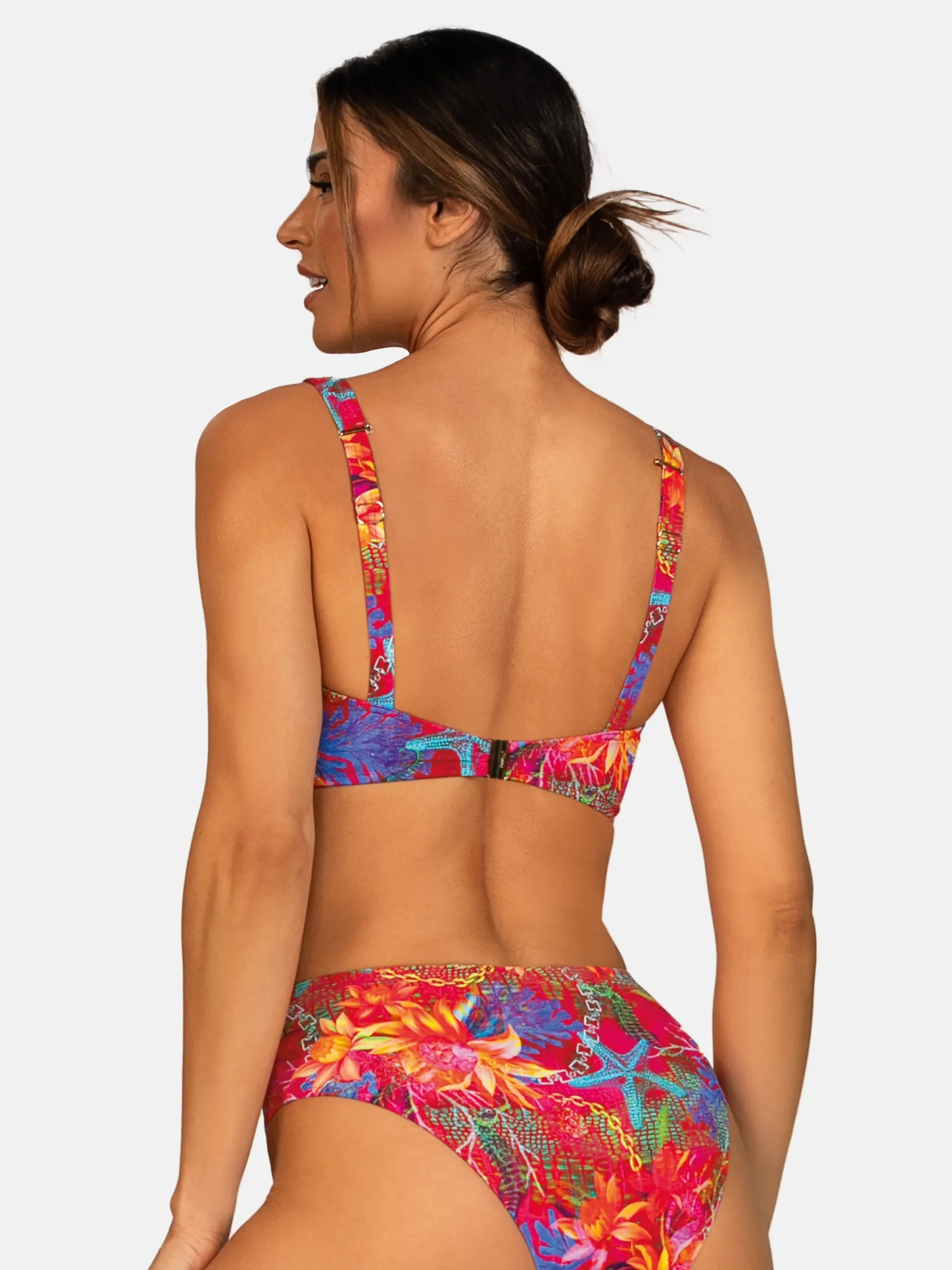 Góra od stroju kąpielowego FG241/921 z linii Podwodna Energia to połączenie egzotycznego stylu, wygody i perfekcyjnego dopasowania. Print inspirowany światem flory i fauny oceanu zachwyca intensywnymi barwami czerwieni, różu, pomarańczu i turkusu. Te żywe kolory pięknie podkreślają kobiecą urodę, dodają blasku i przyciągają spojrzenia. Kostiumy kąpielowe w egzotyczne wzory są chętnie wybierane przez kobiety, które lubią wyróżniać się stylem i czuć wakacyjną energię.