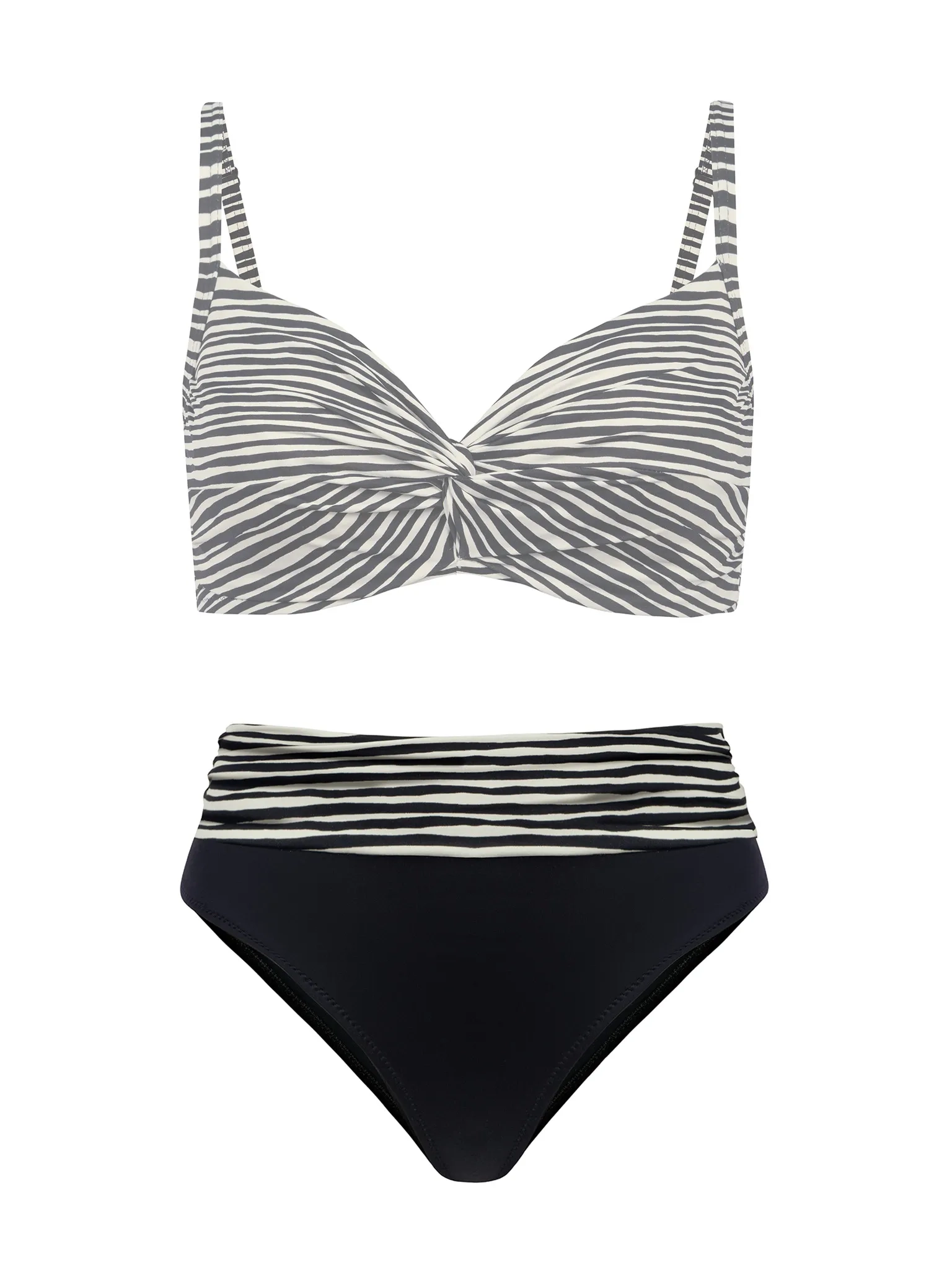 Figi FD10/932 tworzą spójny zestaw z biustonoszami kąpielowymi z linii Czarno-Biały Instynkt - zarówno tymi w paski, jak i gładkimi. Możesz połączyć je z górą w graficzny print, aby podkreślić talię, albo zestawić z jednolicie czarną górą od bikini dla bardziej klasycznego efektu. Dobrze wyglądają także w towarzystwie czarnej odzieży plażowej i dodatków - tuniki, pareo, kimona czy kapelusza - tworząc elegancki, a jednocześnie nowoczesny look.