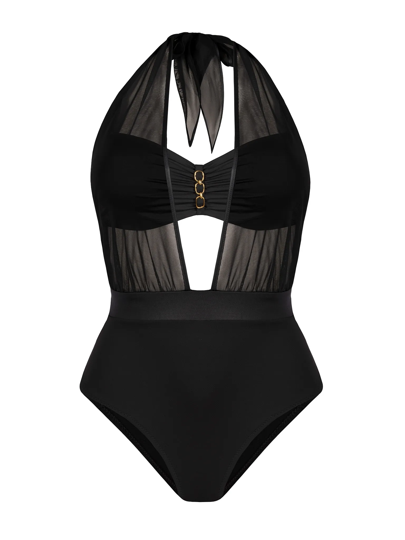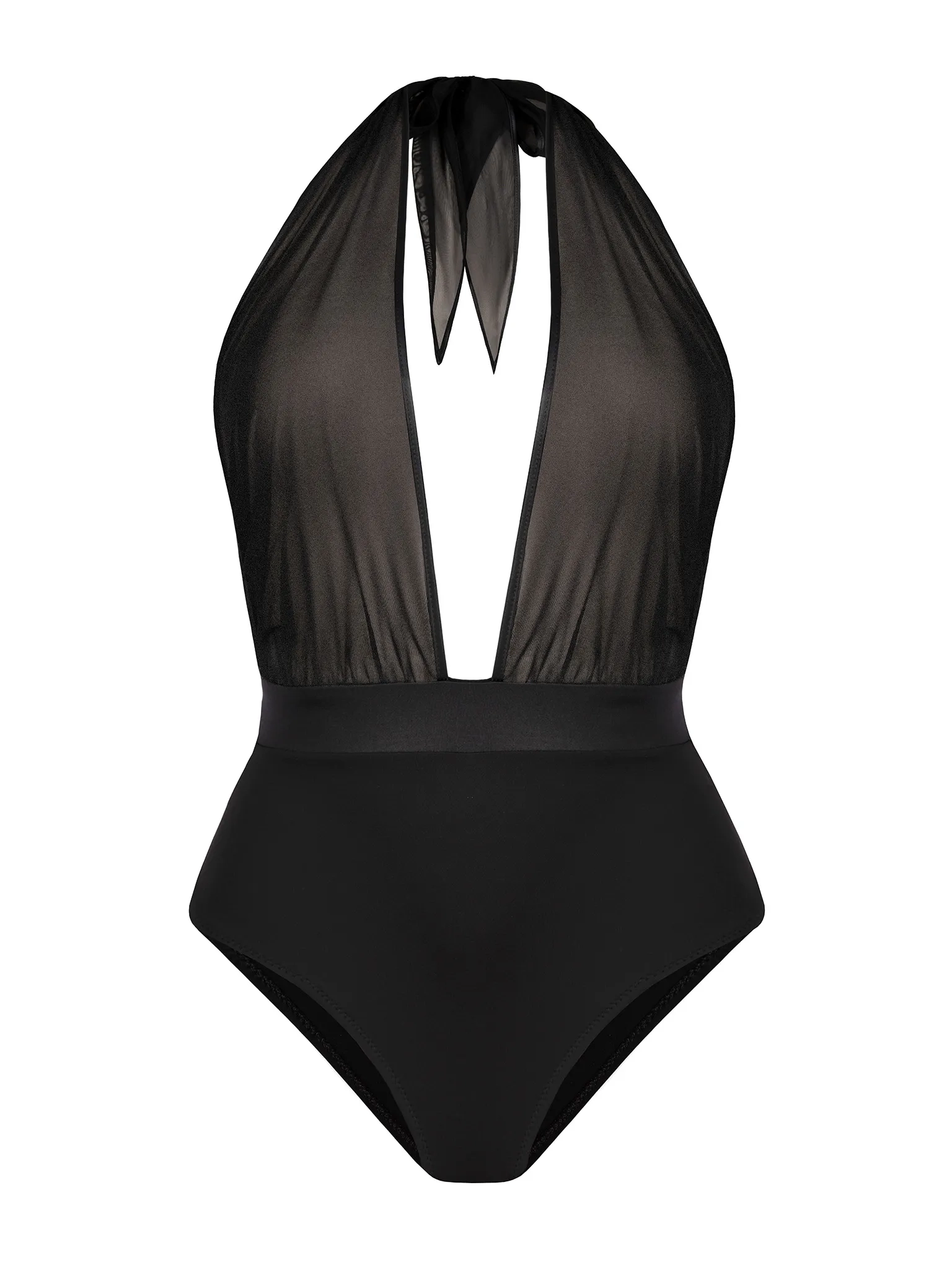 - Czarny kostium jednoczęściowy z głębokim dekoltem V