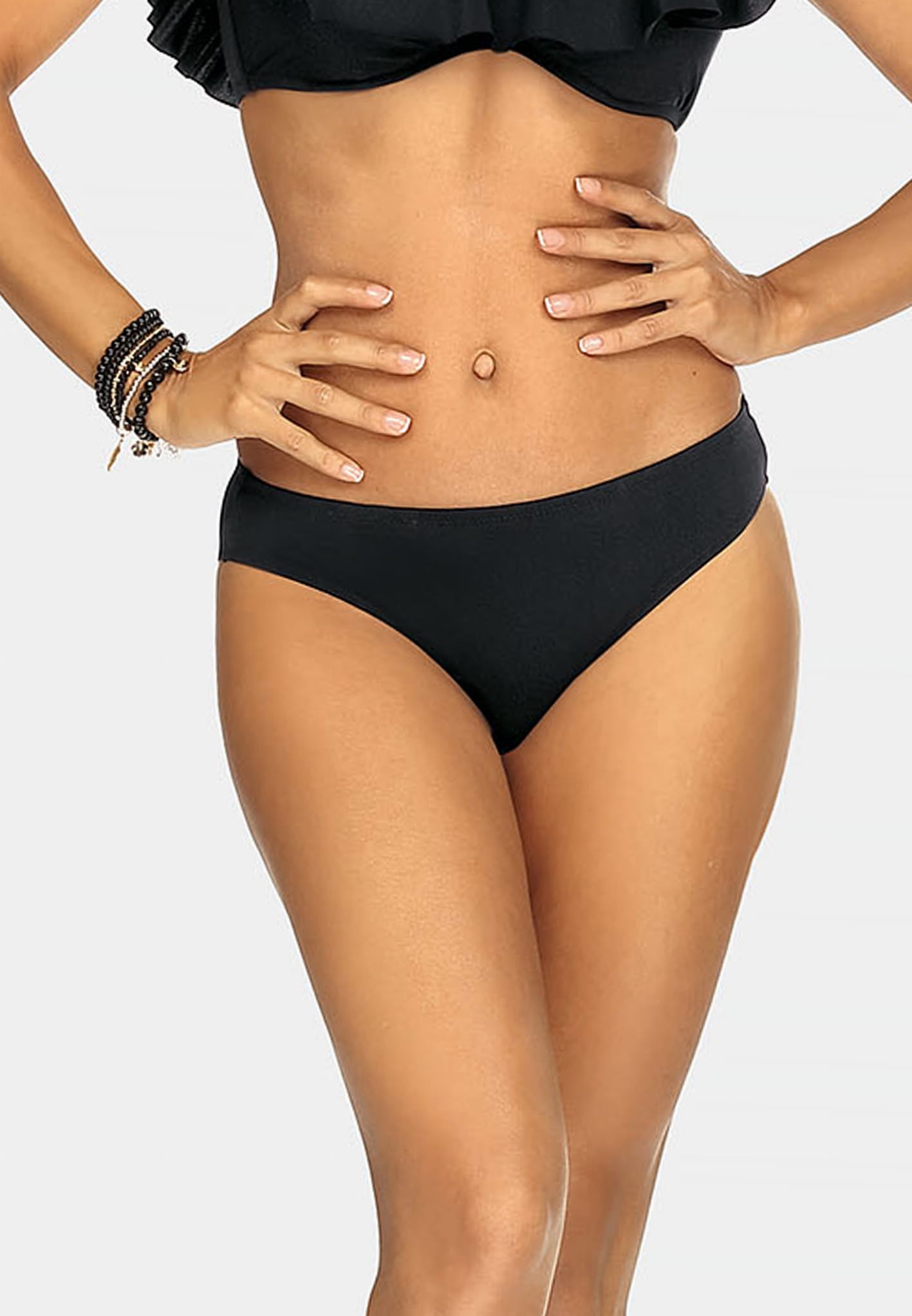 Figi klasyczne z marszczeniem w ponadczasowym czarnym kolorze, który nigdy nie wyjdzie z mody. Ich uniwersalny fason oraz kolor pasują do wszystkich modelów i kolorów biustonoszy kąpielowych. Możesz dowolnie łączyć je z wybraną przez siebie górą, przez co stworzone bikini będzie niepowtarzalne i wyjątkowe.