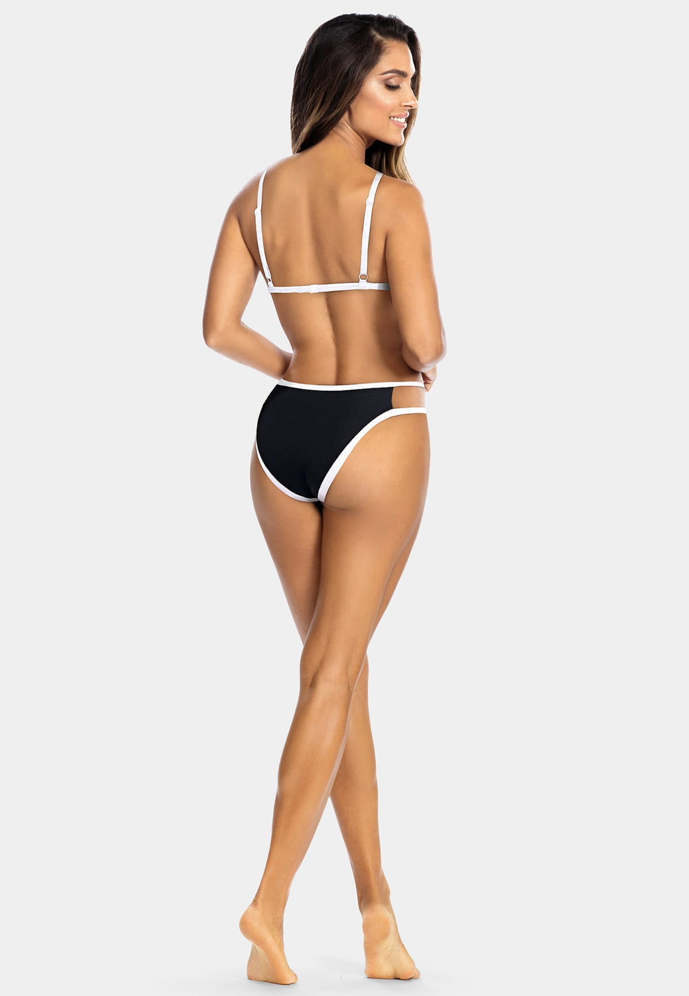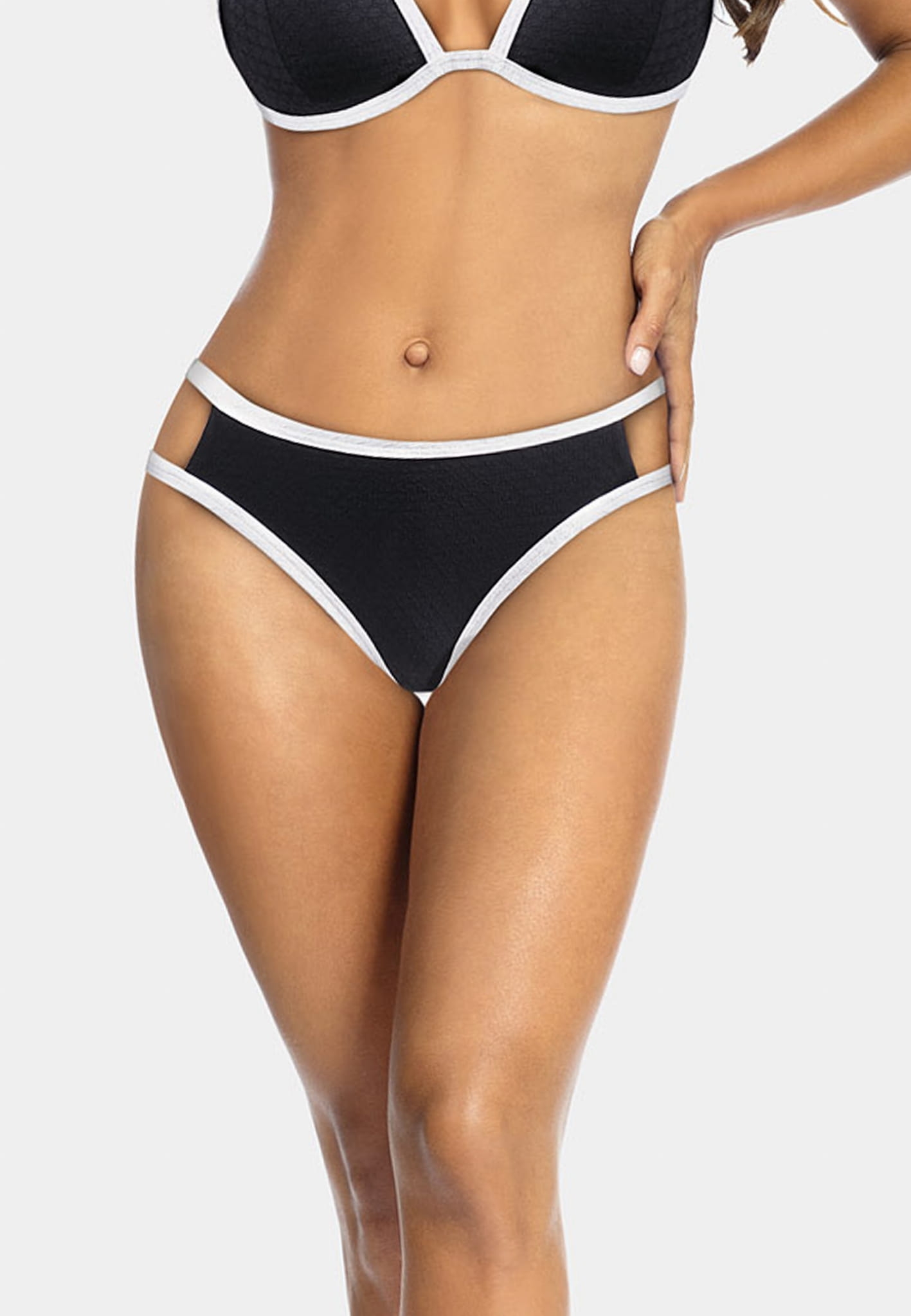 Prezentowany dół od stroju plażowego FLD16 to idealny wybór dla kobiet chcących podkreślić swoje kształty oraz opaleniznę. Uszyty został z połączenia czarnej i białej, strukturalnej, lekko wypukłej tkaniny kąpielowej. Kontrastowe zestawienie barw dodaje całości wyrazistego rysu. To damskie figi kąpielowe o klasycznym, ponadczasowym, sprawdzonym kroju, który dopasowuje się idealnie do sylwetki. Majtki posiadają ozdobne paseczki po bokach (po dwa paseczki z każdej strony). Klasyczne kolory umożliwiają połączenie ich z dowolną górą stroju plażowego.