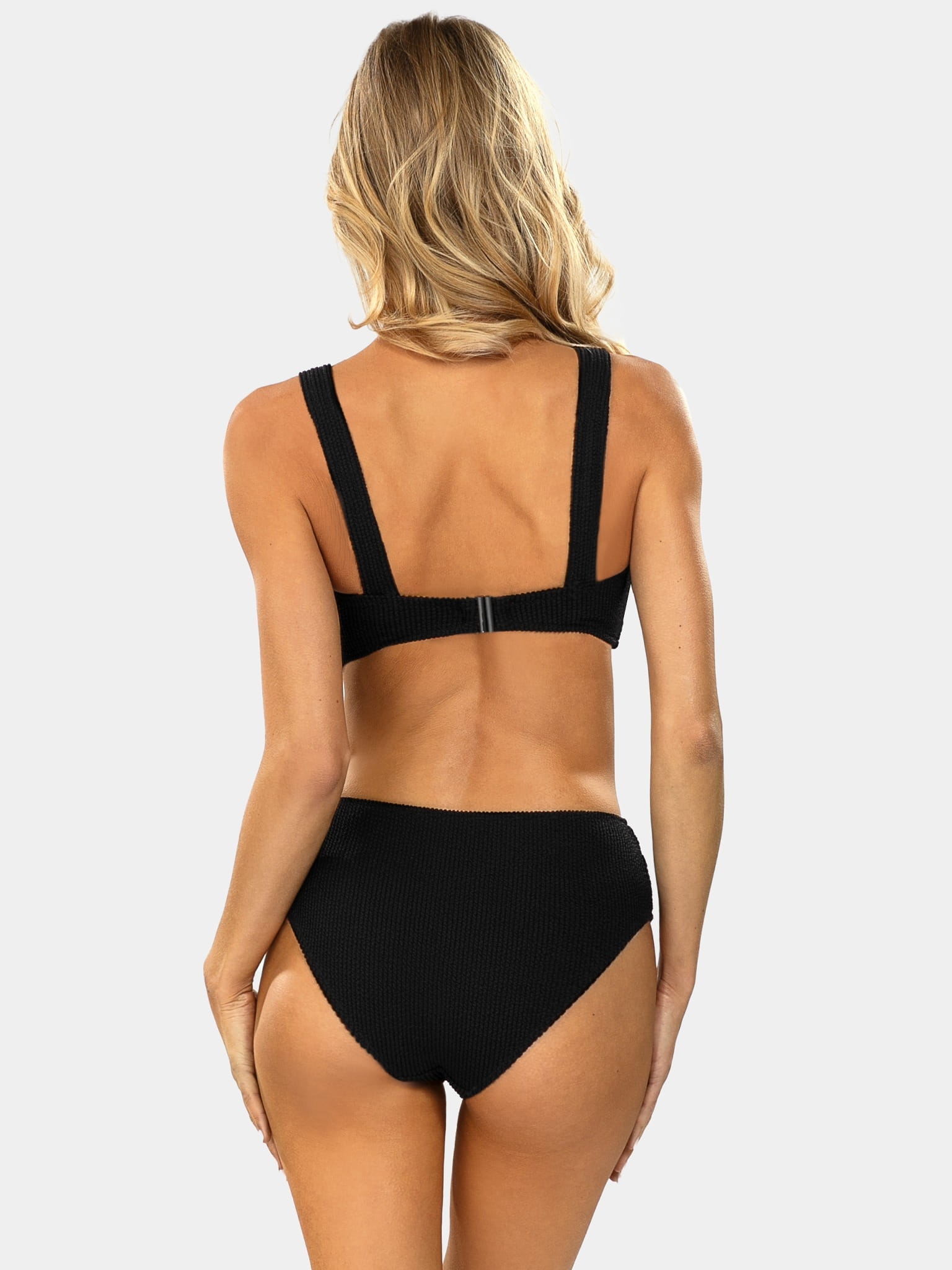 Biustonosz w formie topu zaprojektowano z myślą o kobietach z większym biustem, począwszy od rozmiaru 36E/F aż do 42E/F. Wyjmowane wkładki kształtują i podtrzymują biust, zapewniając stabilność i wygodę bez konieczności używania fiszbin. Grubsze ramiączka oraz solidne zapięcie na zatrzask z tyłu gwarantują pełne wsparcie, co czyni ten top idealnym wyborem zarówno na aktywności sportowe, jak i na spokojny relaks na plaży. Figi kąpielowe o wysokim stanie modelują brzuch, zapewniając pełne zakrycie pośladków i wygodę noszenia. Sportowy krój i pełny fason sprawiają, że strój jest komfortowy i funkcjonalny, doskonały do pływania oraz innych letnich aktywności.