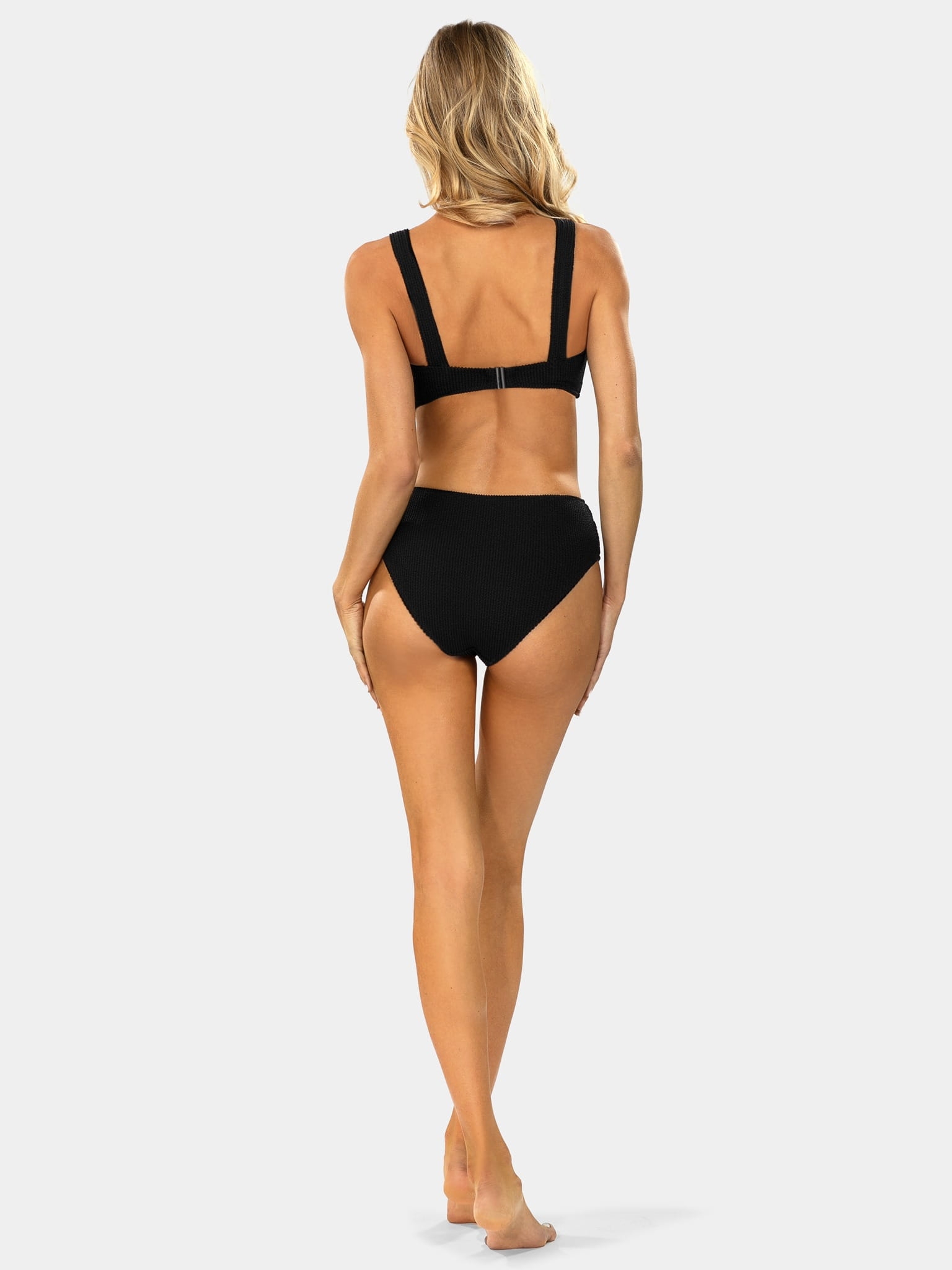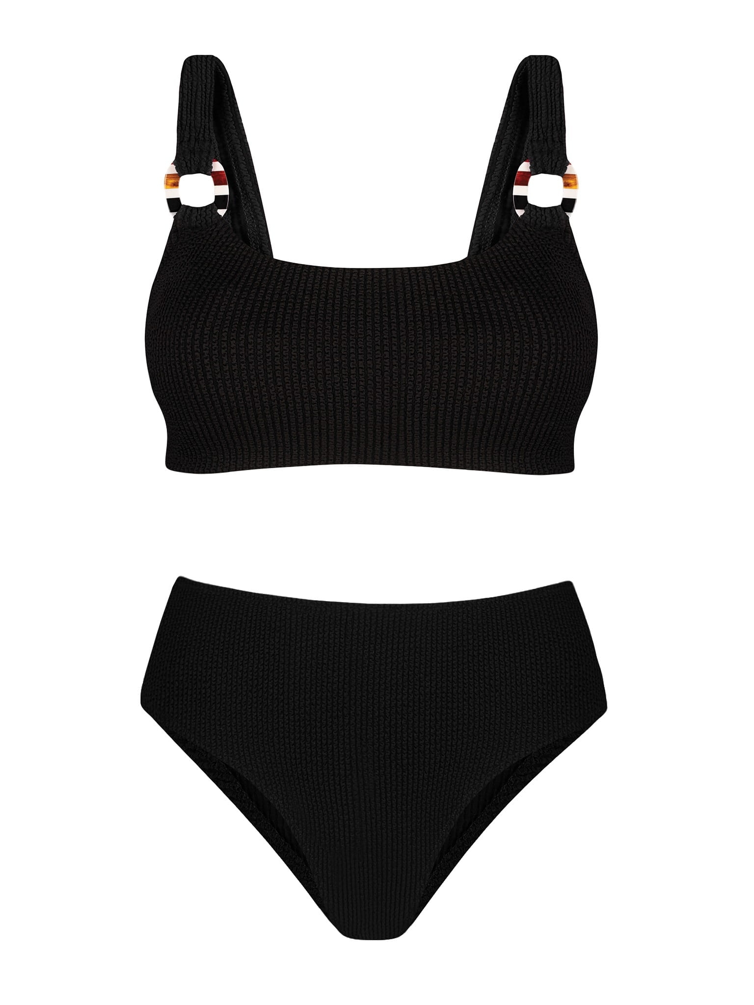 Idealny wakacyjny look z czarnym dwuczęściowym bikini w prążek