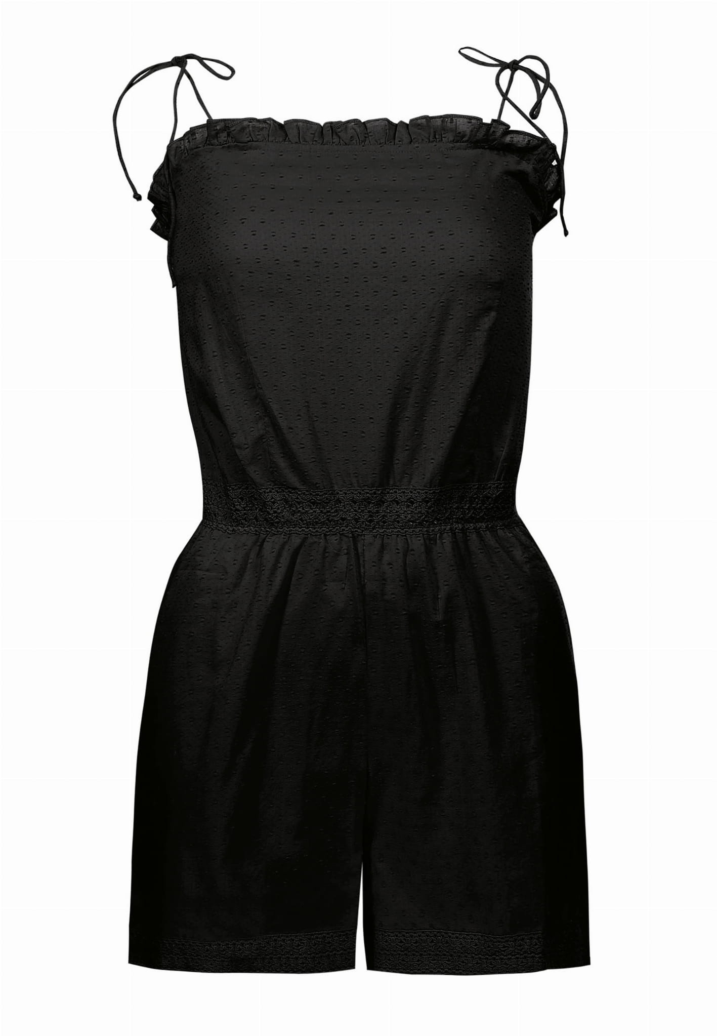 Nasza propozycja w kolekcji odzieży damskiej - kombinezon krótki model F194 to doskonała opcja urozmaicenia Twojej letniej garderoby, nie tylko plażowej. Materiał, z jakiego został wykonany to przyjemna bawełna w czarnym kolorze. Klasyczna, uniwersalna, czarna barwa czyni go bardzo praktycznym dodatkiem na lato. Z pewnością będzie dobrze wyglądał w połączeniu z modnym kapeluszem lub torbą. Fason z krótkimi nogawkami, nieco luźniejszy dla zapewnienia maksymalnego komfortu podczas noszenia. Część górna to top z wiązanymi ramiączkami o prostym dekolcie wykończonym delikatną falbanką. Długie ramiączka pozwalają związać je w ozdobną, dziewczęcą kokardę (na ramionach lub nieco bardziej z tyłu, lub z przodu). Część dolna to luźne spodenki (długość do połowy uda), które zostały połączone z topem ściągającą gumką w pasie. Po obu bokach w części spodenek umieszczono kieszenie. Elementem dekoracyjnym, nawiązującym do stylu boho są ozdobne, delikatne hafty umieszczone w pasie oraz przy dole nogawek. Krój kombinezonu - nieco luźniejszy - ładnie układa się pod kobiece kształty, maskując ewentualne niedoskonałości.