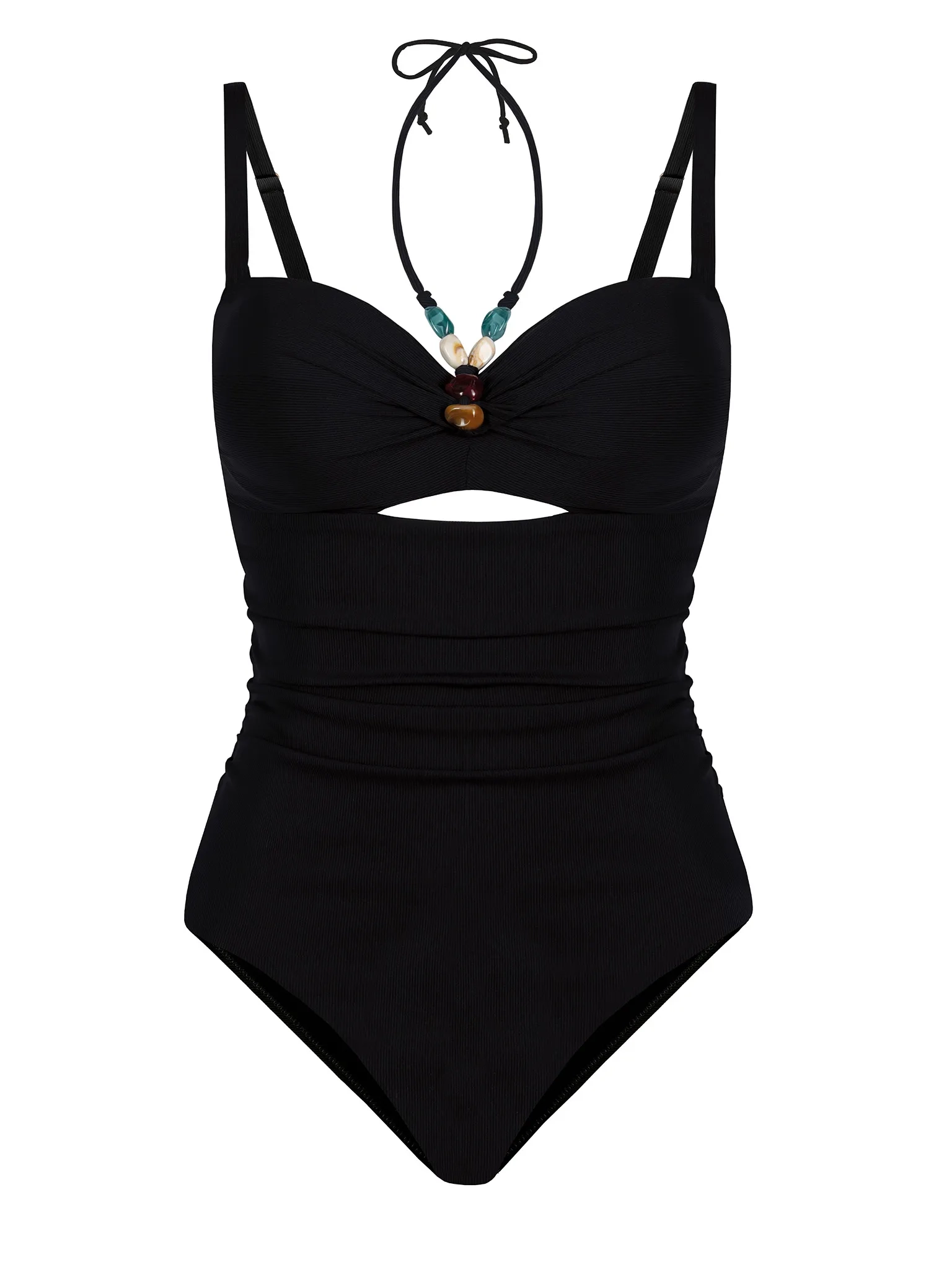 Czarny strój kąpielowy to plażowy odpowiednik „małej czarnej” - wysmukla sylwetkę, podkreśla kontrast ze skórą i nigdy nie wychodzi z mody. Jest najbardziej uniwersalny: pasuje do każdego typu urody, do złotej biżuterii, słomkowych dodatków i kolorowej odzieży plażowej. W linii Mozaika Natury czerń zyskuje nowoczesną formę dzięki drobnej, prążkowanej strukturze - materiał ma pionowy, delikatny prążek, jest miękki i bardzo przyjemny w dotyku, a jednocześnie wygląda szlachetnie w słońcu.