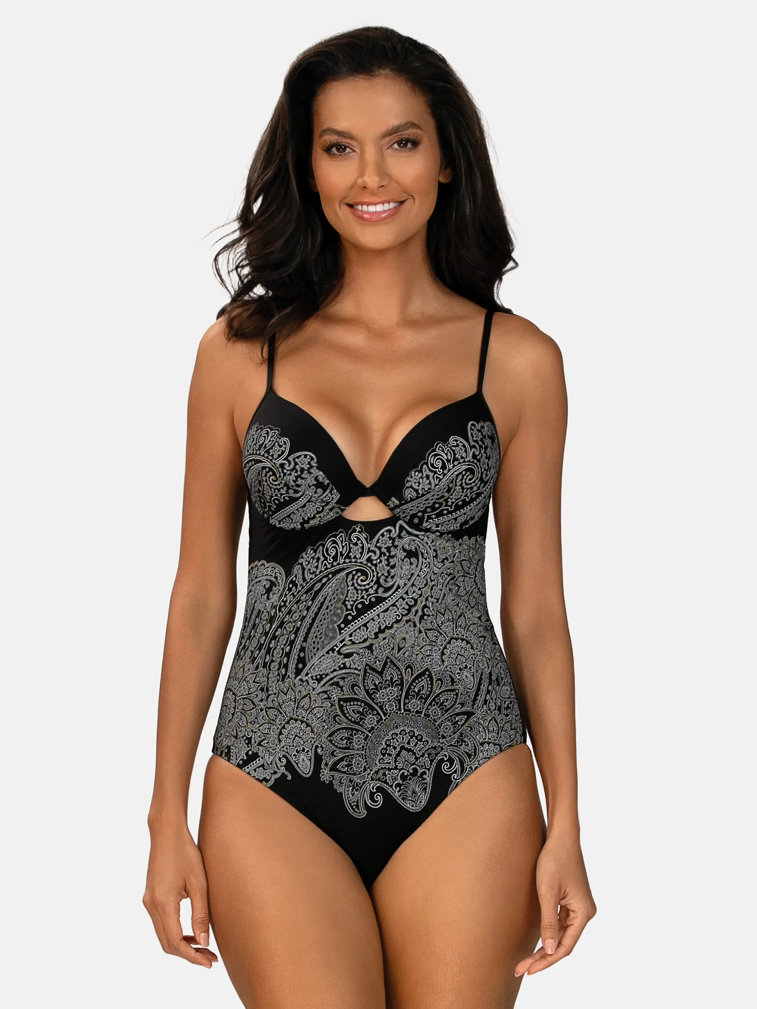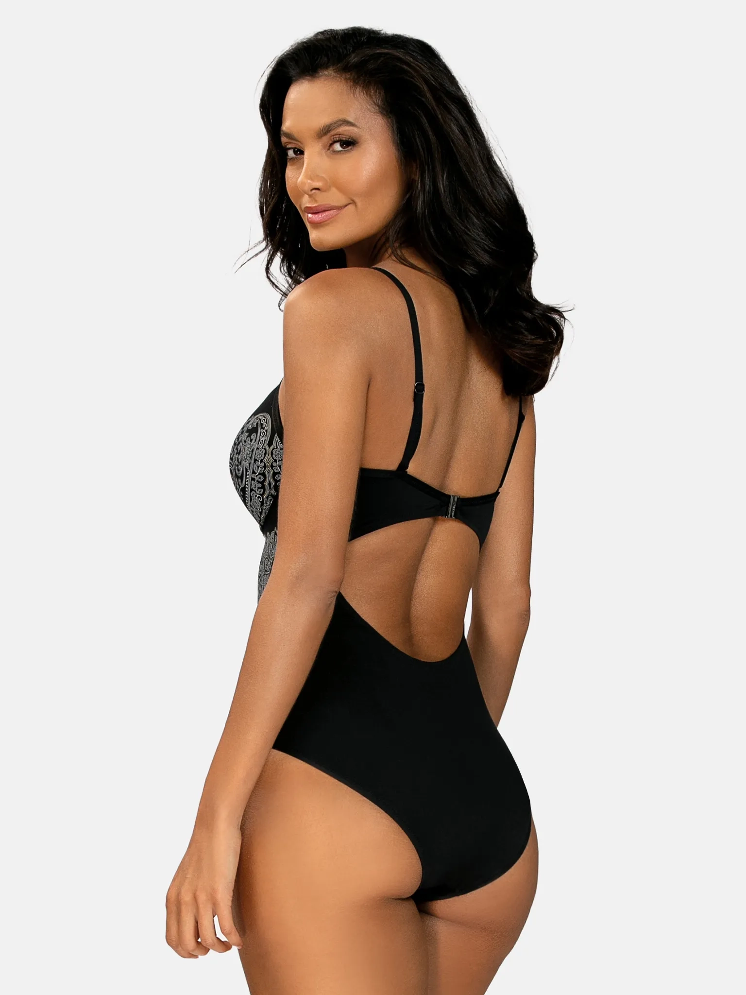 Szukasz kostiumu, który łączy luksusowy wygląd z perfekcyjnym dopasowaniem? Trafiłaś idealnie - model F28B/931 zachwyca czarną bazą i wysmakowanym, orientalnym motywem paisley w odcieniach srebra i złota. Ten ponadczasowy wzór to historyczny „łezkowy” motyw o persko-indyjskich korzeniach od wieków symbolizujący elegancję i nie wychodzący z mody - dziś wraca w świeżych, biżuteryjnych interpretacjach, również w modzie plażowej. Ten model wyróżnia się nie tylko dzięki swojej funkcjonalności, ale także poprzez wyjątkowy design. Czarny kolor jest uniwersalny i ponadczasowy – idealnie pasuje do każdej karnacji i każdej sylwetki, wysmuklając ją i dodając klasy. Strój został zaprojektowany tak, aby podkreślać kształty kobiecego ciała oraz uwypuklić dekolt. Dzięki efektowi push-up, nawet Panie z mniejszym biustem mogą cieszyć się pełniejszym kształtem.