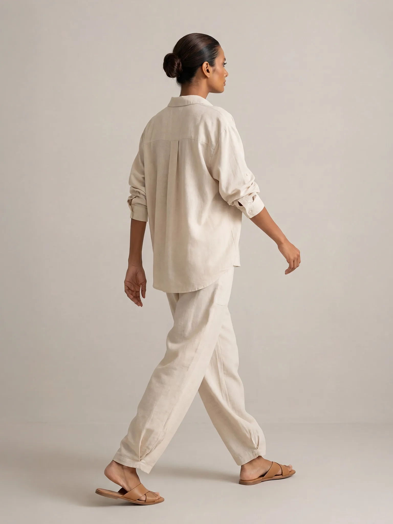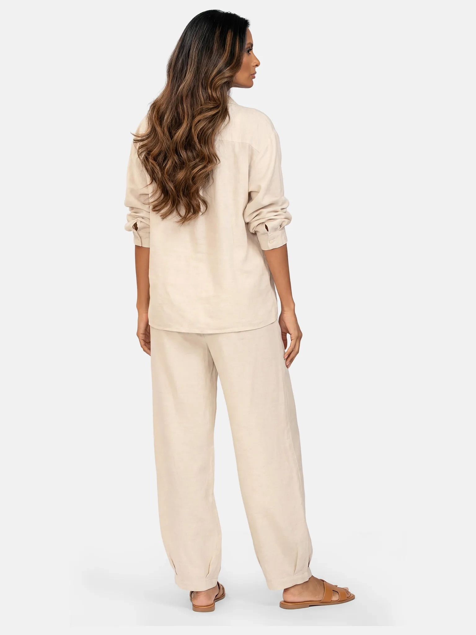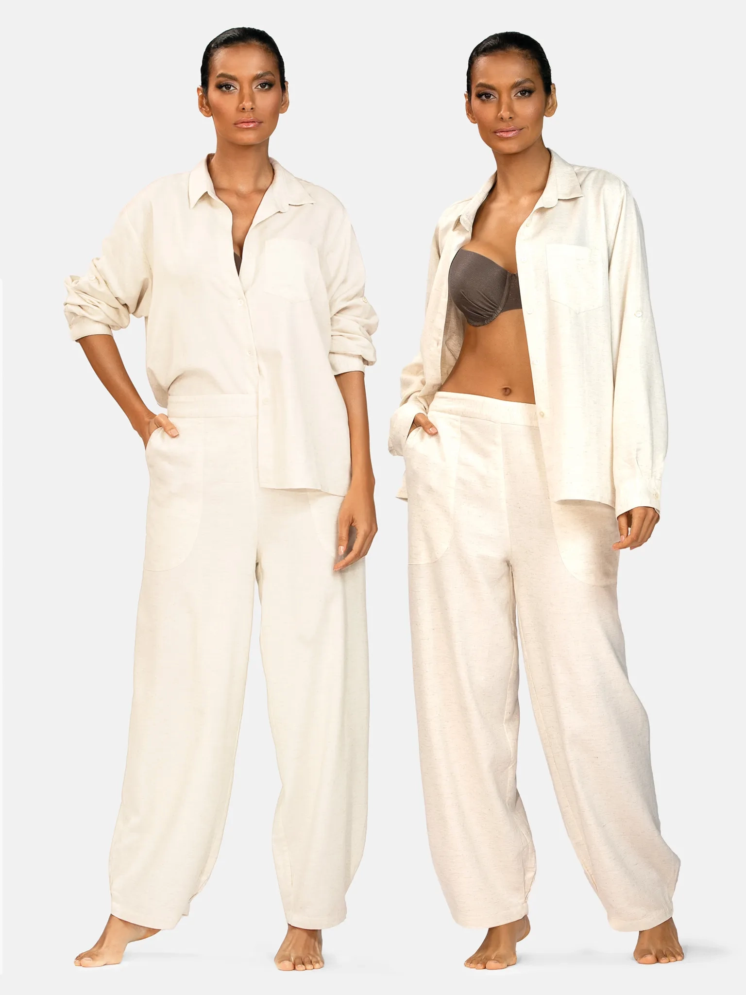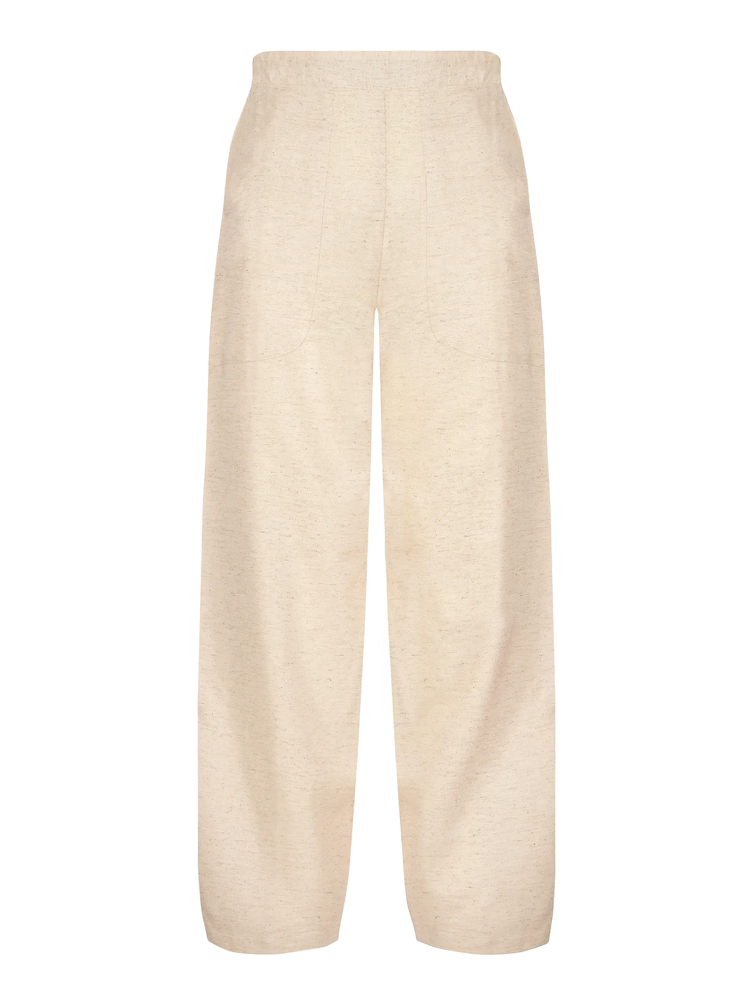 Model ten ma komfortowy, prosty krój z długą nogawką i lekko podwyższonym stanem. Szeroka, elastyczna gumka w pasie dopasowuje się do talii, nie uciskając i nie ograniczając ruchów, co jest idealne podczas plażowania, spacerów po promenadzie czy długiej podróży. Luźne, opływające nogawki nie opinają ud i łydek, dzięki czemu spodnie subtelnie maskują ewentualne niedoskonałości sylwetki i pięknie układają się w ruchu. Wygodne boczne kieszenie podkreślają casualowy charakter modelu i przydają się na drobiazgi, gdy wychodzisz z hotelu tylko w kostiumie i spodniach. Stonowany odcień beżu oraz prosta linia sprawiają, że te spodnie plażowe z lnem pasują zarówno do bikini, jak i do zwykłego topu czy koszuli, tworząc komplet "beach to city".