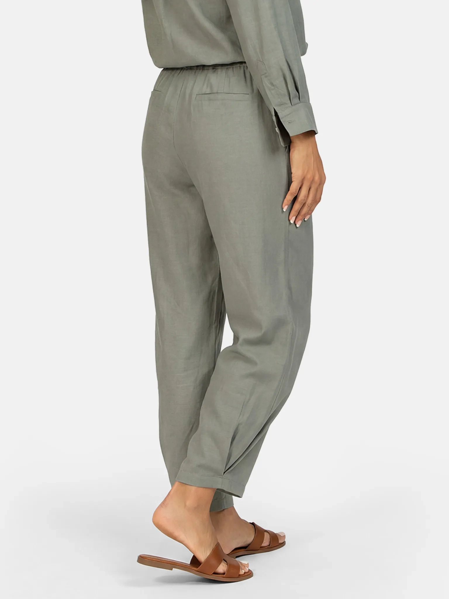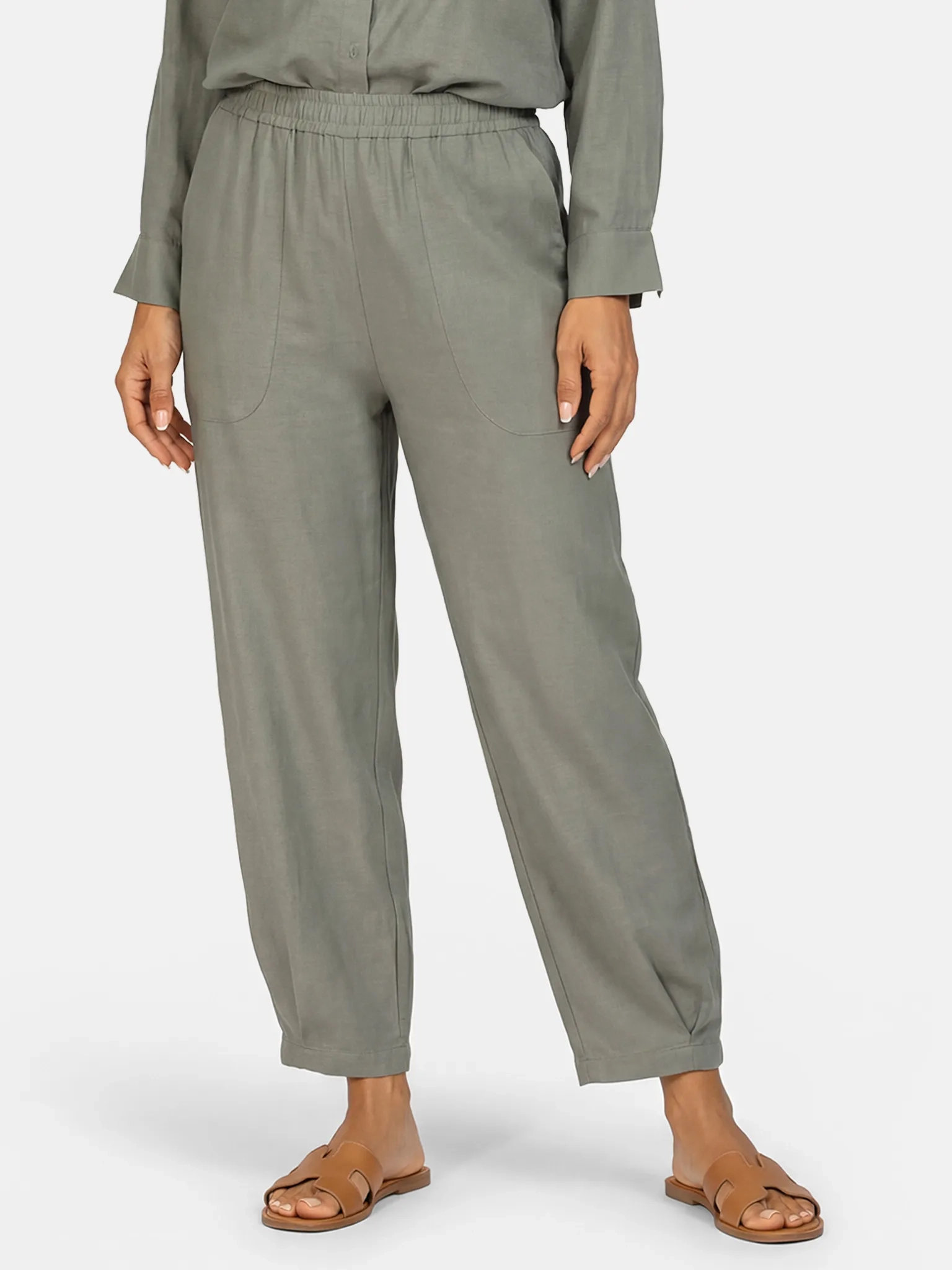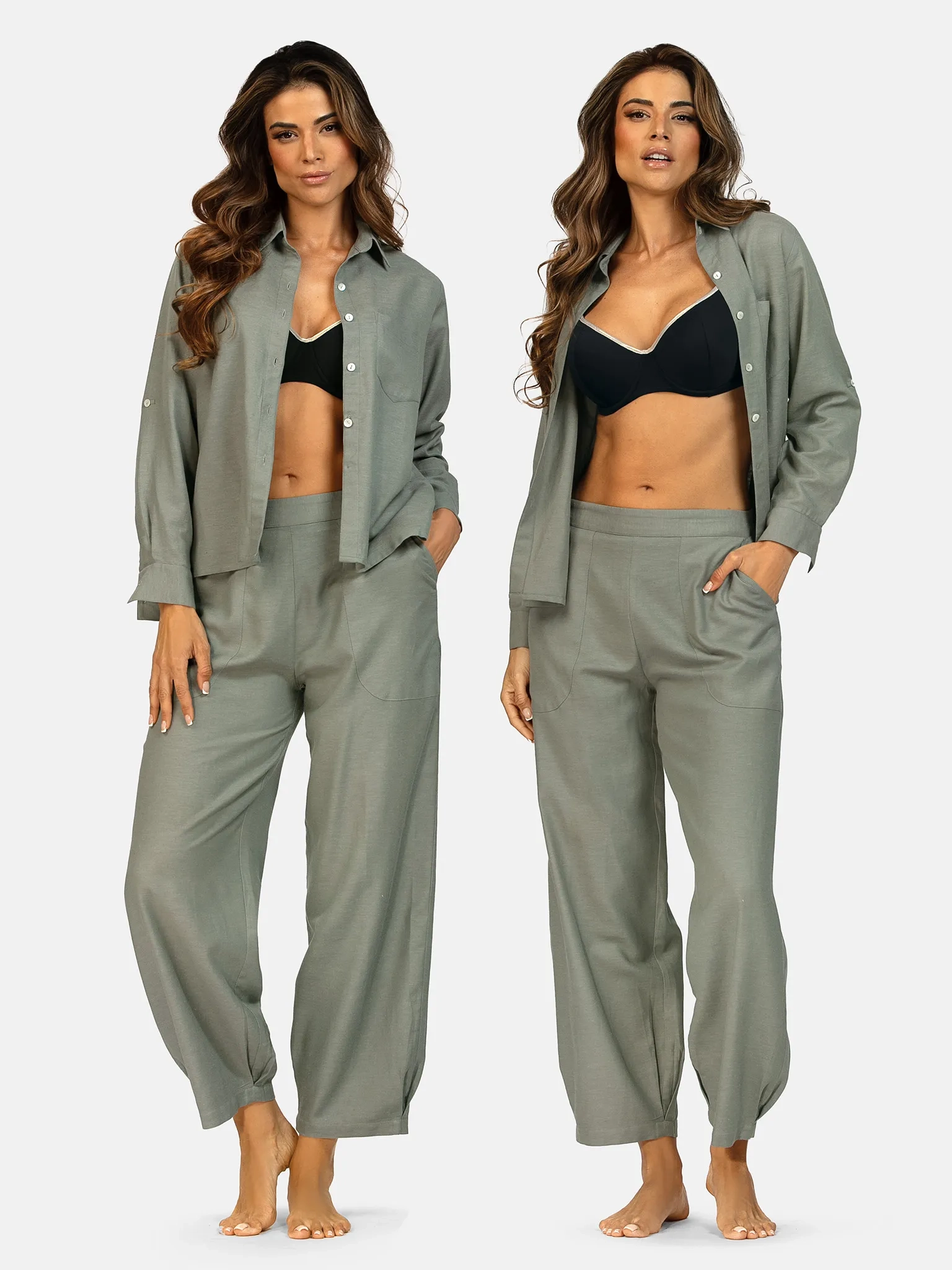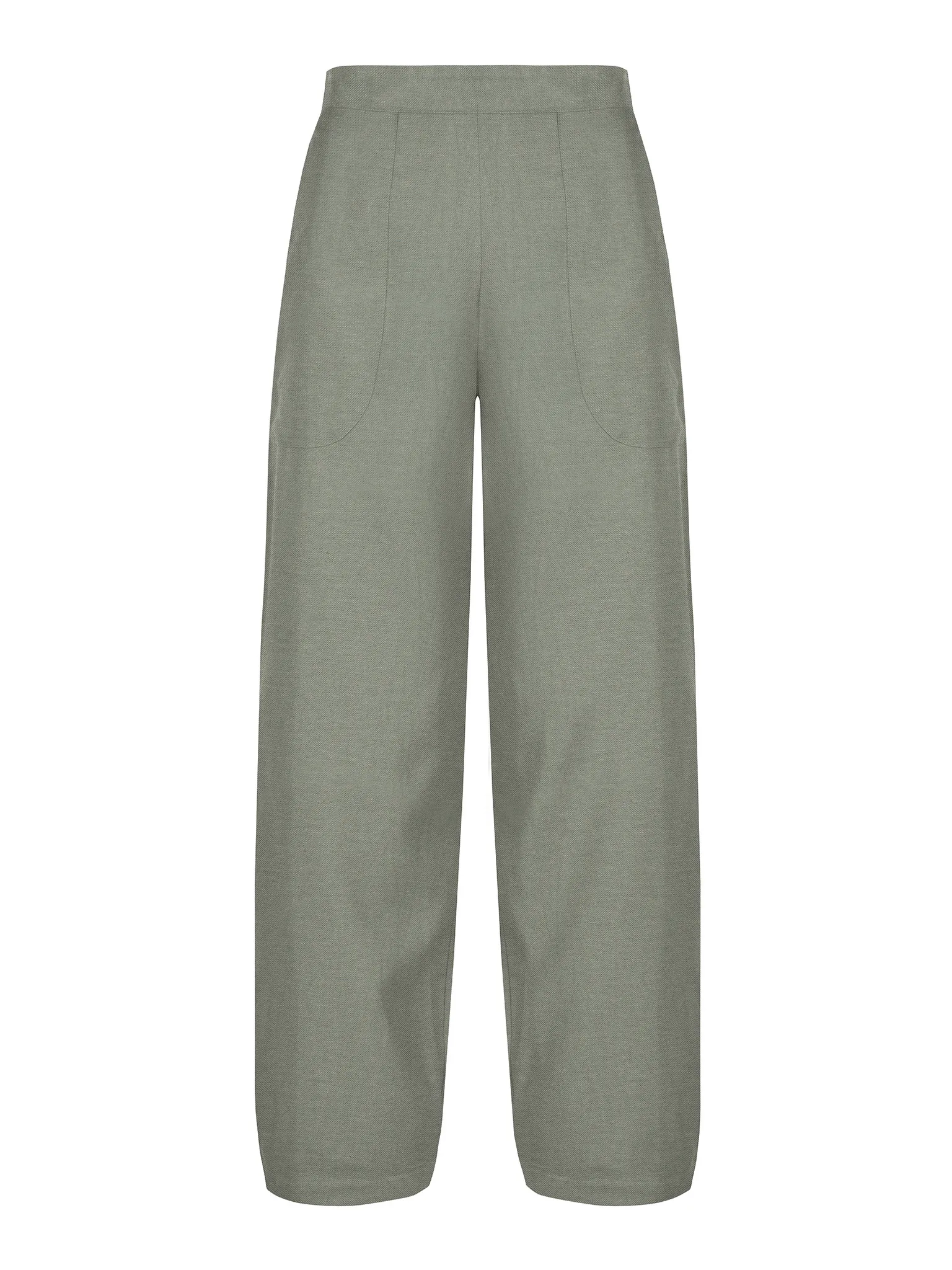 Model ten ma komfortowy, prosty krój z długą nogawką i lekko podwyższonym stanem. Szeroka, elastyczna gumka w pasie dopasowuje się do talii, nie uciskając i nie ograniczając ruchów, co jest idealne podczas plażowania, spacerów po promenadzie czy długich podróży. Luźne, opływające nogawki nie opinają ud i łydek, dzięki czemu spodnie subtelnie maskują ewentualne niedoskonałości sylwetki i pięknie układają się w ruchu. To model, który łączy wygodę spodni dresowych z bardziej uporządkowanym, „resortowym” wyglądem. Wygodne boczne kieszenie podkreślają casualowy charakter modelu i przydają się na drobiazgi, gdy wychodzisz z hotelu tylko w kostiumie i spodniach. Stonowany odcień khaki oraz prosta linia sprawiają, że te spodnie plażowe z lnem pasują zarówno do bikini, jak i do zwykłego topu czy koszuli, tworząc komplet typu "beach to city".