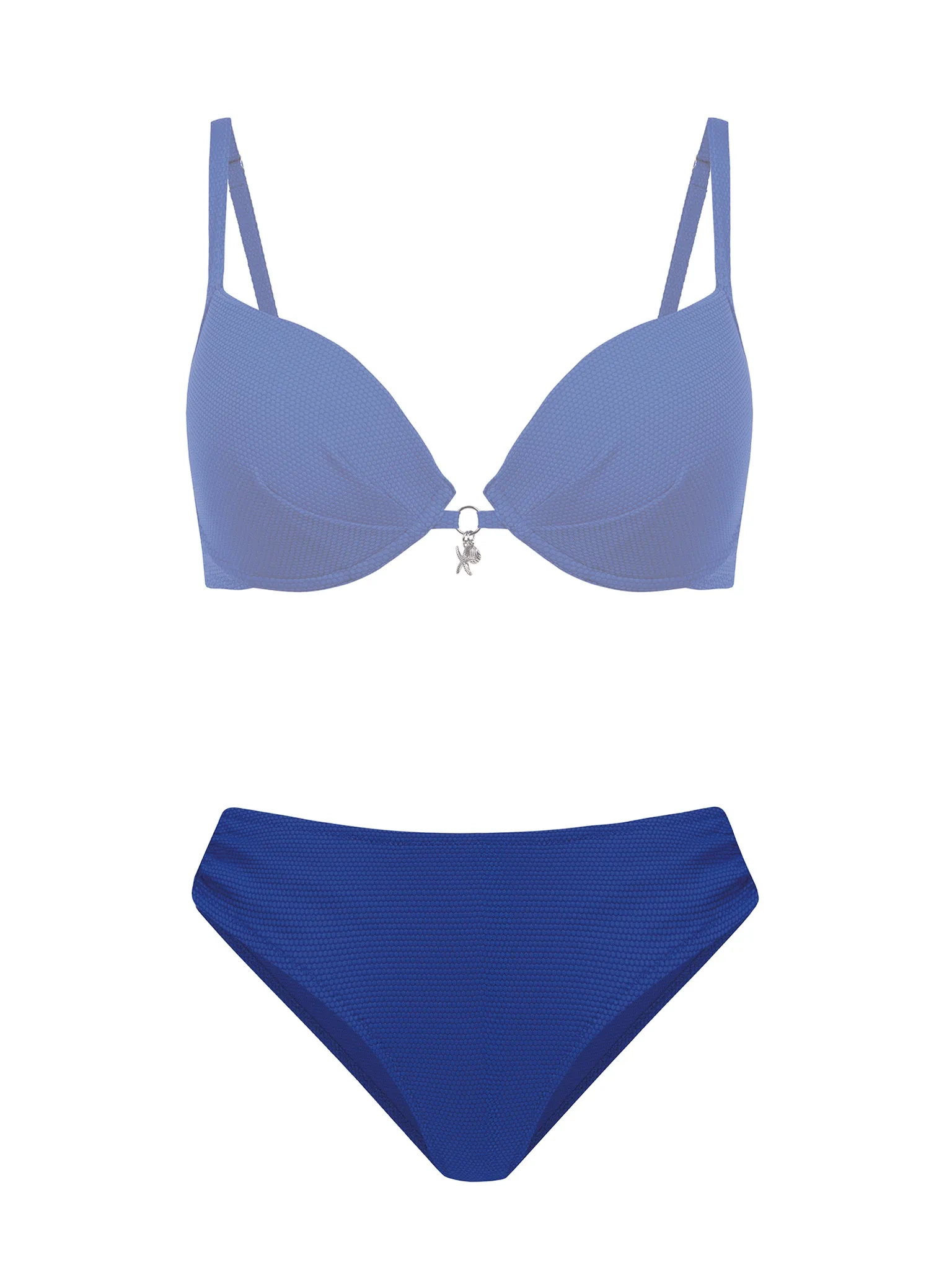 Kobaltowy Dotyk to linia dla kobiet, które kochają prostotę w luksusowym wydaniu. Figi FD21A/604V uszyto z mięsistej, strukturalnej tkaniny o delikatnym „wafelkowym” wykończeniu, która pięknie łapie światło i sprawia, że jednolity kobalt nie jest płaski, lecz głęboki i szlachetny. Intensywny odcień niebieskiego podkreśla opaleniznę, wysmukla optycznie sylwetkę i świetnie wygląda zarówno solo, jak i w komplecie z kobaltową górą od bikini. To klasyczny dół od kostiumu kąpielowego, który nie wychodzi z mody - idealny na wakacje, basen i weekendowe wypady nad wodę.