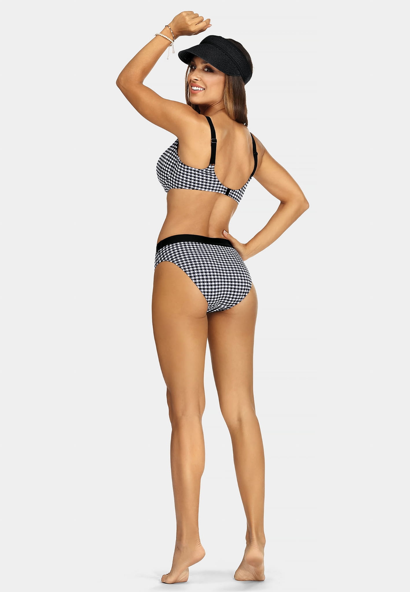Majtki od kostiumu plażowego model FD20/824 posiadają klasyczny, ponadczasowy, sprawdzony krój, który dopasowuje się do Twojej sylwetki. Dół od bikini wykończony w pasie ozdobną gumą (szerokość ok. 3 cm), która dodatkowo zapewnia lepsze trzymanie na biodrach i nieco spłaszcza okolice pod pępkiem (wysmuklenie okolic brzucha). Perfekcyjnie zaprojektowane o anatomicznym kroju, gwarantują prawdziwy komfort noszenia. Miksuj i zestawiaj ten model z biustonoszami z linii Checkered oznaczonej numerem 824.