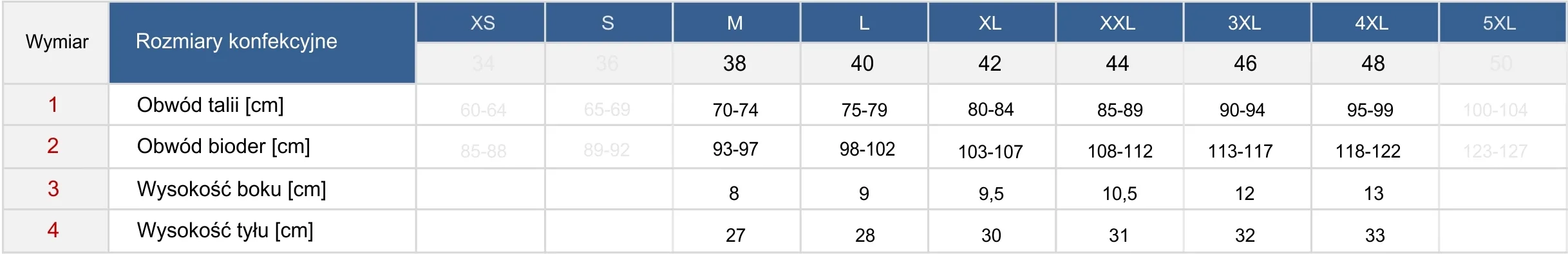 - Rozmiary: M/38, L/40, XL/42, XXL/44, 3XL/46, 4XL/48