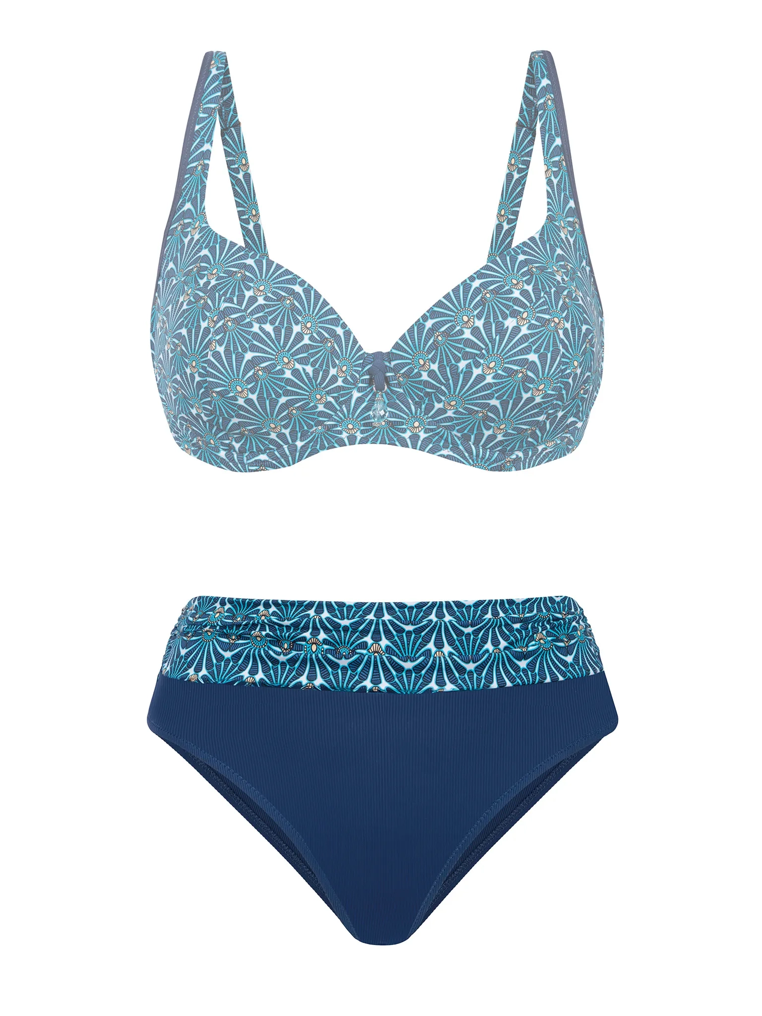 Granatowy dół świetnie wysmukla optycznie biodra, a ozdobny pas w princie Blue Orient (motyw orientalno-morski w odcieniach błękitu, turkusu i granatu) pięknie nawiązuje do biustonoszy z tej samej linii. To idealny wybór, jeśli chcesz stworzyć spójny, elegancki komplet lub bawić się modą w stylu mix & match.