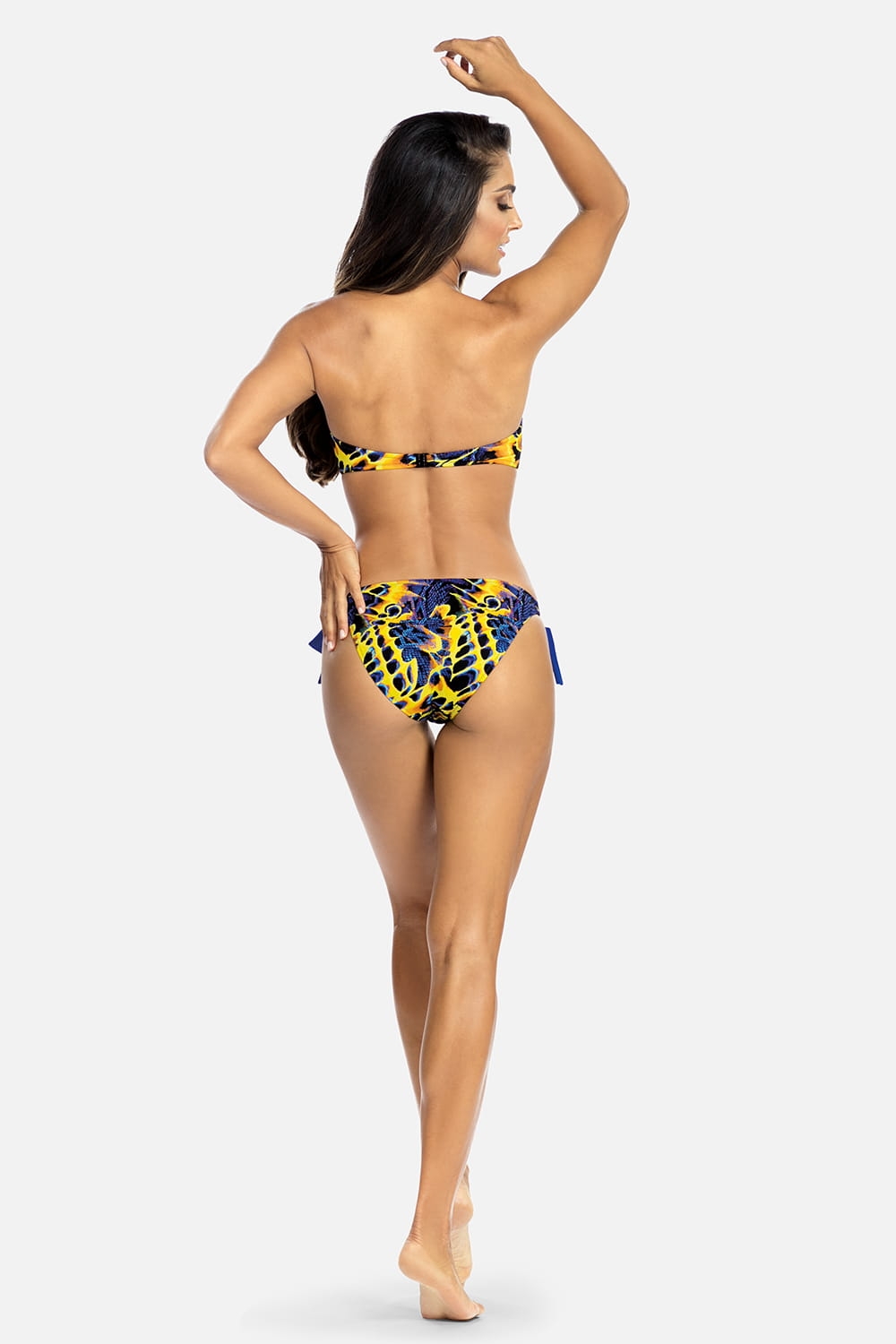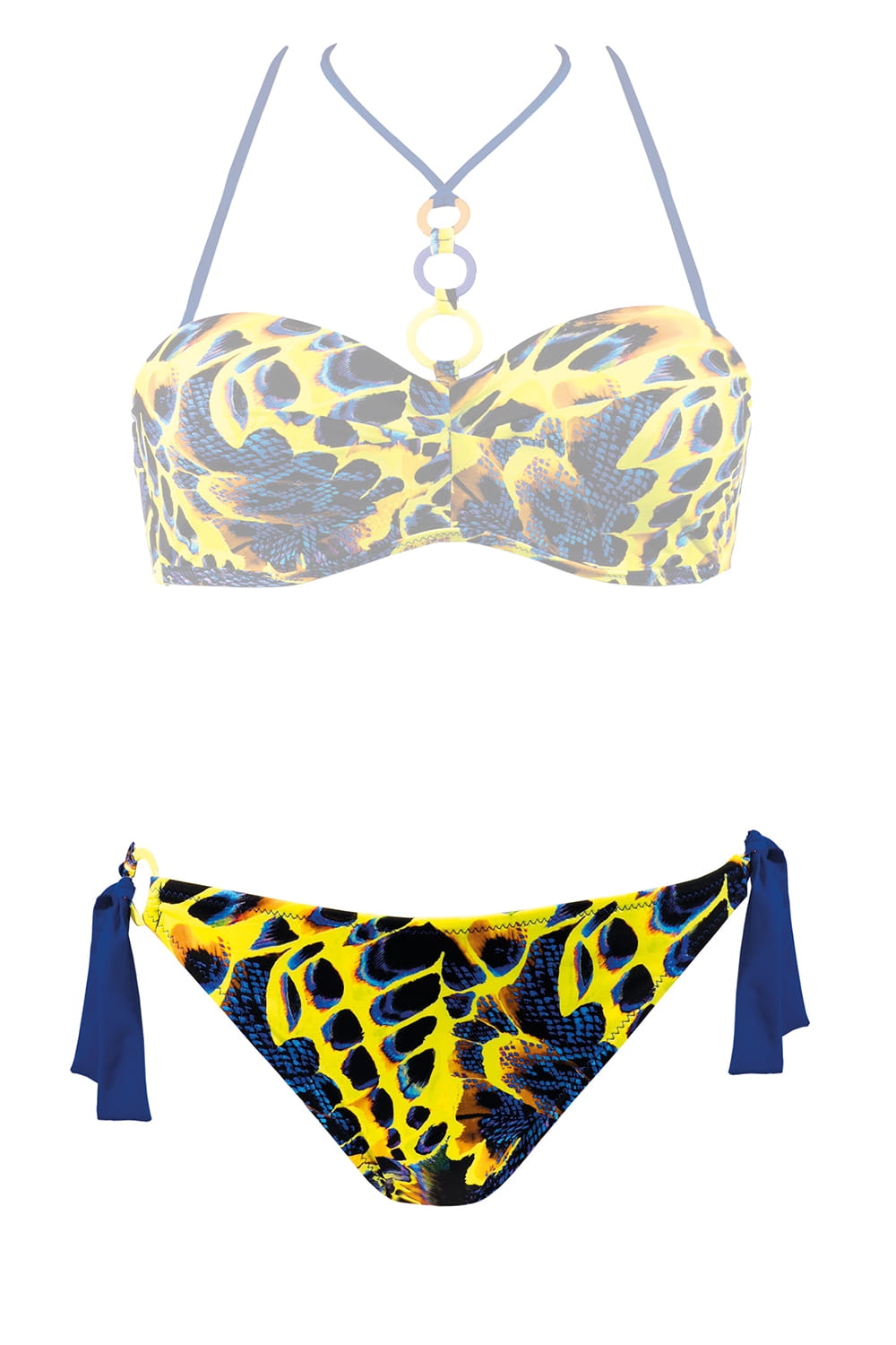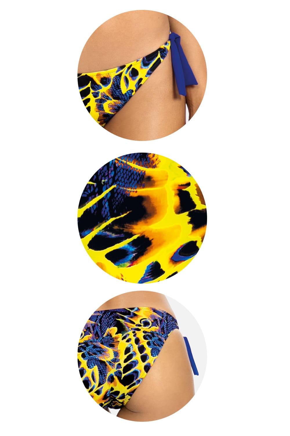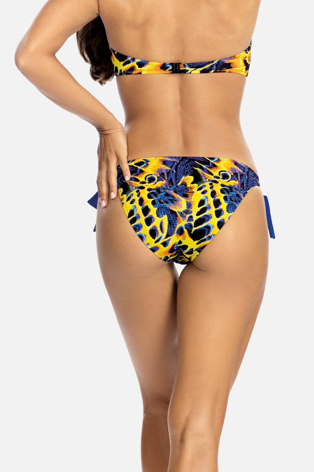 Damskie, nowoczesne, ponadczasowe biodrówki kąpielowe (nie tylko do kostiumów typu bikini), to propozycja dla kobiet, które wymagają od bielizny kąpielowej najwyższej jakości. Krój fig optycznie wydłuża nogi i eksponuje pośladki i uwydatnia pupę. Figi o wąskim boku, posiadają zdobne chabrowe wiązania (które można usunąć). Z prawej strony na biodrze umieszczono żółte, ozdobne kółeczko, które pięknie nawiązuje do całości. Ten model to świetne rozwiązanie dla miłośniczek opalania.