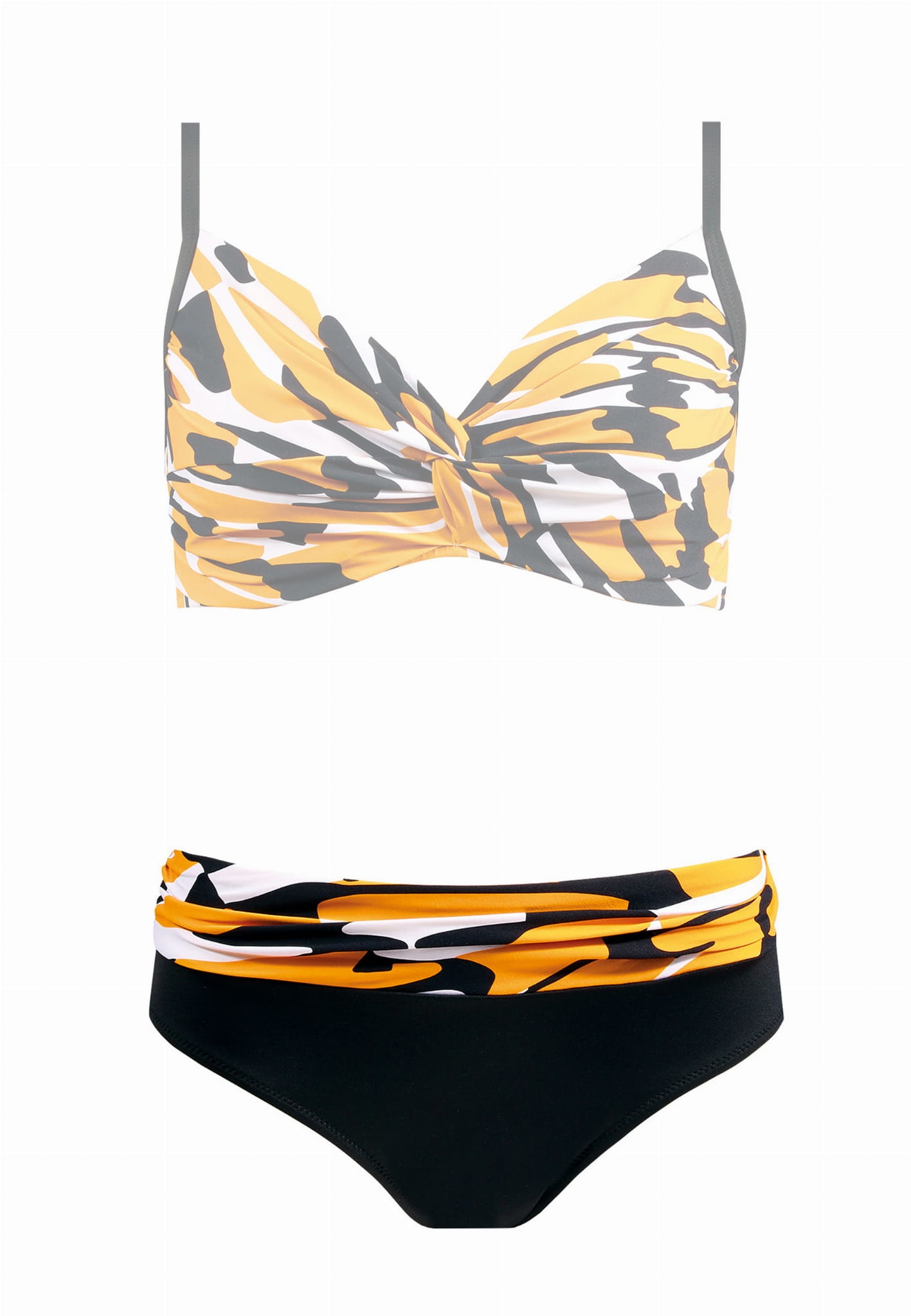 Kostiumy kąpielowe z linii Mango przyciągają wzrok przez geometryczny print w niesymetrycznie ułożone o różnych wielkościach wzory. Pomarańczowe i czarne kolory na białym tle, mocno kontrastują ze sobą, tworząc abstrakcyjny wzór. Szczególną uwagę przyciąga pomarańczowy kolor, który kojarzy się z owocem mango. Kolor ten to absolutny hit ostatnich sezonów.