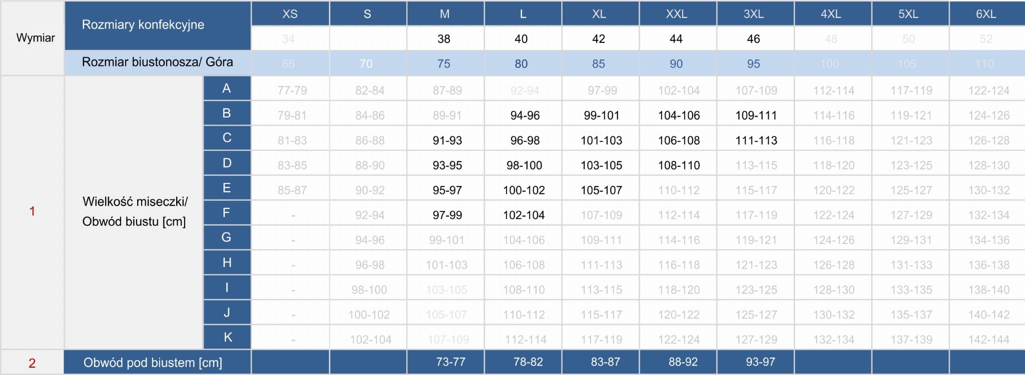 Produkowany w rozmiarach 38CDEF 40BCDEF 42BCDE 44BCD 46BC
