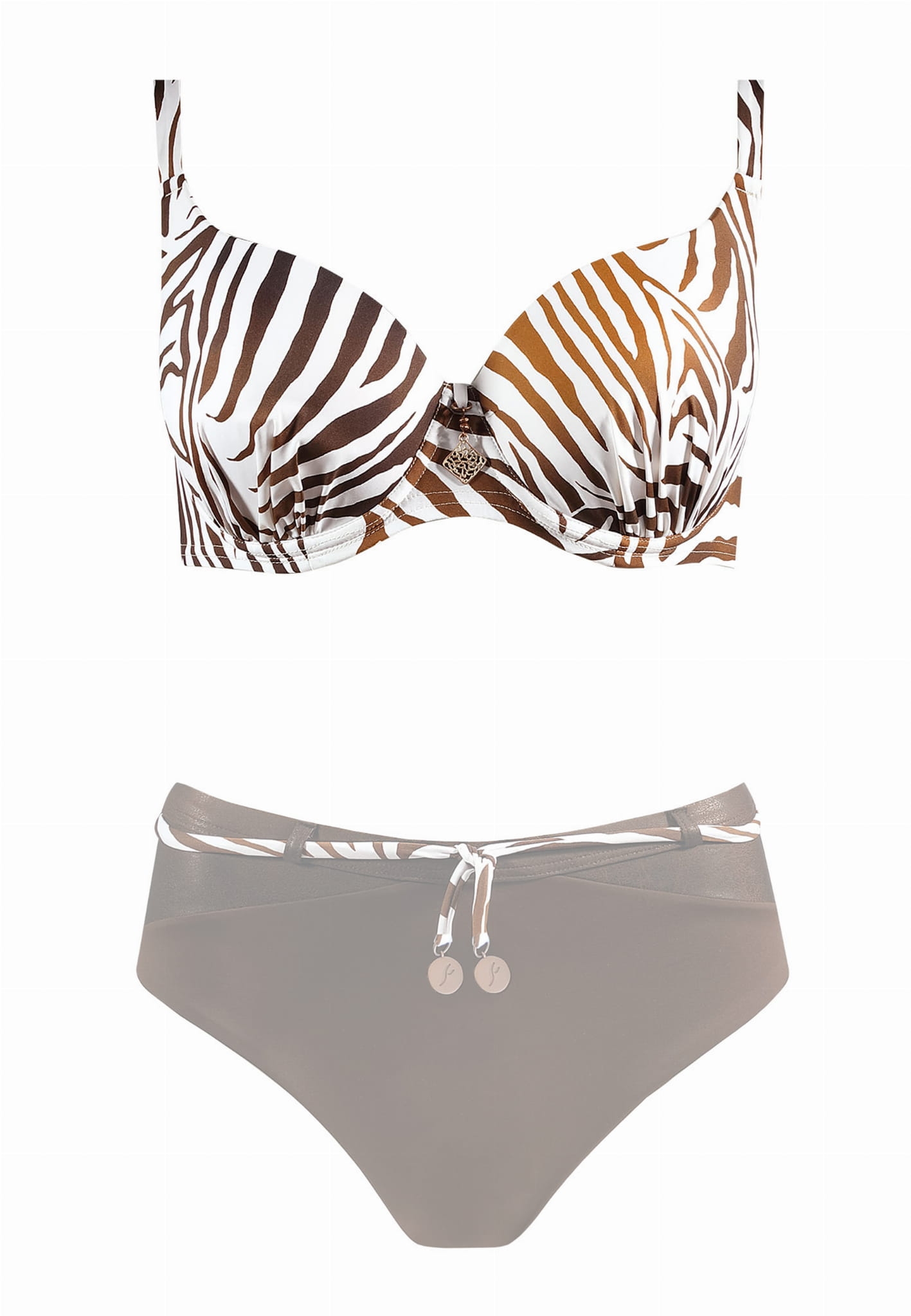 Koniecznie podkreśl swoją odwagę i wyróżnij się na plaży tego lata. Wybierz strój kąpielowy w zwierzęce printy inspirowane Afryką i Safari. To piękne, naturalne i modne kolory ziemi, w których poczujesz się nie tylko kobieco i seksownie, ale też podkreślisz swoją opaloną cerę, muśniętą wakacyjnym słońcem. Jeśli zastanawiasz się, czy kostium w zwierzęce printy jest dla Ciebie - nie wahaj się! Nasza najnowsza linia Safari to Twój nowy przepis na kobiecość. Wzór imitujący paski zebry, w jasnych i ciemnych odcieniach brązu został skomponowany tak, aby podkreślać Twoje kobiece kształty i nadawać sylwetce powabu. Doskonale zaprezentuje się niezależnie od tego, jaki rozmiar miseczki nosisz.