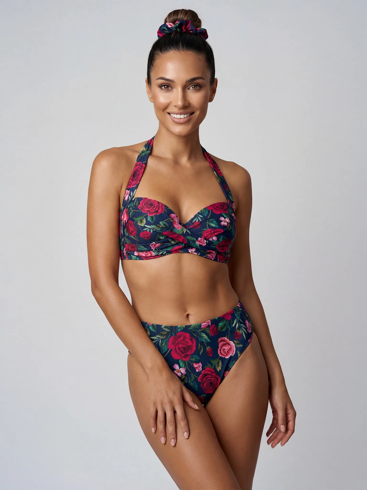 Scrunchie G03/927 pięknie łączy się z kostiumami z linii Różana Energia - zarówno z printem w róże na granacie, jak i z gładką fuksją. To prosty sposób, by stworzyć spójny look i podkreślić klimat kolekcji.