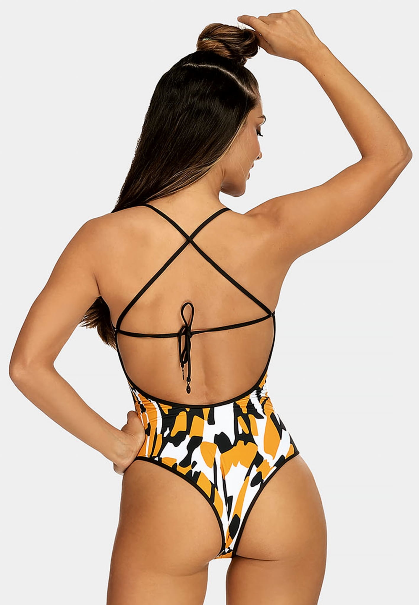 Wycięty strój kąpielowy wiązany na plecach w abstrakcyjny wzór