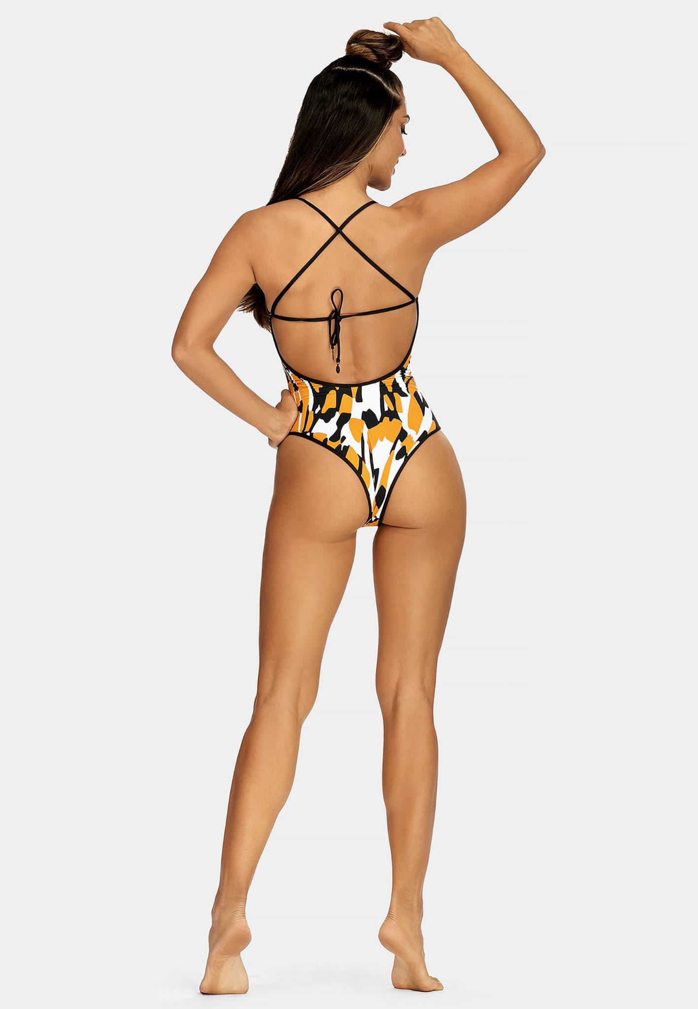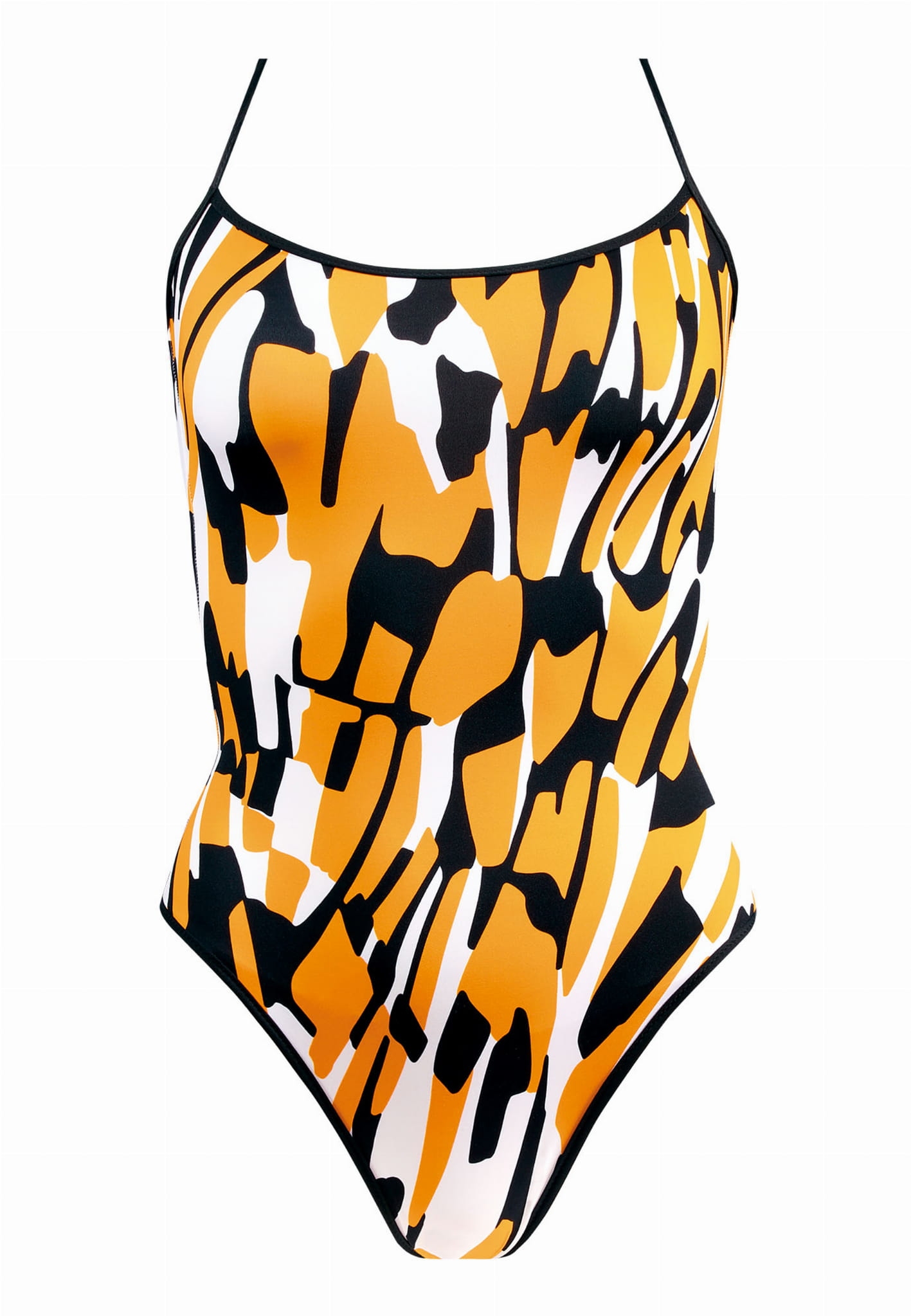 Model kostiumu jednoczęściowego F149/825 to propozycja dla bardziej odważnych kobiet miłujących kolor i nietuzinkowy krój. Kostium ma cienkie ramiączka krzyżowo wiązane z tyłu - ładnie zdobiące plecy. Nogawki wysoko wycięte do wysokości biodra, tył w stylu brazylian (tanga). Strój bez usztywnień, bez fiszbin, podszyty w całości drugą warstwą materiału co sprawia, że świetnie modeluje sylwetkę (posiada głębszy, okrągły dekolt). Zastosowanie dużego wzoru i modnych kolorów, nadaje kostiumowi charakteru i niebanalnego designu. Model ten może posłużyć również jako body, idealnie sprawdzi się w codziennych stylizacjach, w połączeniu z jeansami czy spódnicą.