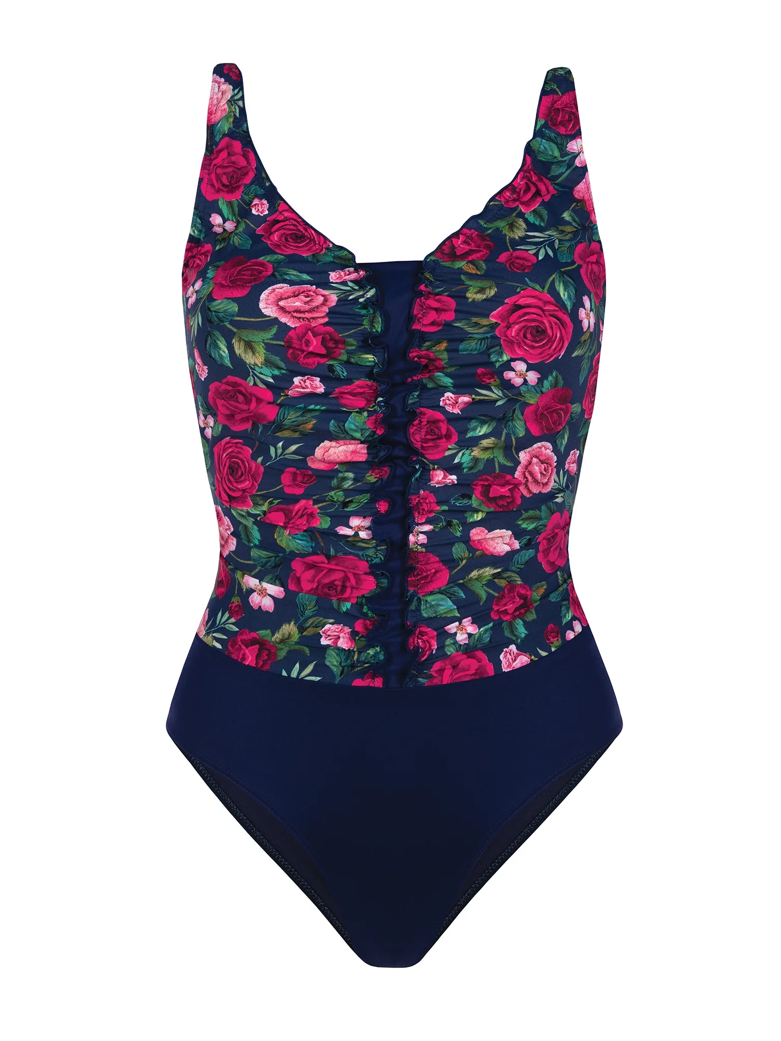 Model F33/927 to jednoczęściowy kostium kąpielowy inspirowany kolekcją Różana Energia, w której głęboki granat stanowi idealne tło dla bogatego, różanego ogrodu w odcieniach od delikatnego pudru po intensywny malinowy. Kwiatowy print w róże przyciąga wzrok i podkreśla naturalne piękno, a jednocześnie wpisuje się w najnowsze trendy mody plażowej 2026, gdzie wzory florystyczne królują na światowych wybiegach. Kostiumy kąpielowe w kwiaty to klasyka, po którą chętnie sięgają kobiety ceniące romantyczne akcenty i dziewczęcy wdzięk - print dodaje świeżości, sprawia, że cera wygląda promiennie, a każda sylwetka prezentuje się wyjątkowo twarzowo i kobieco.