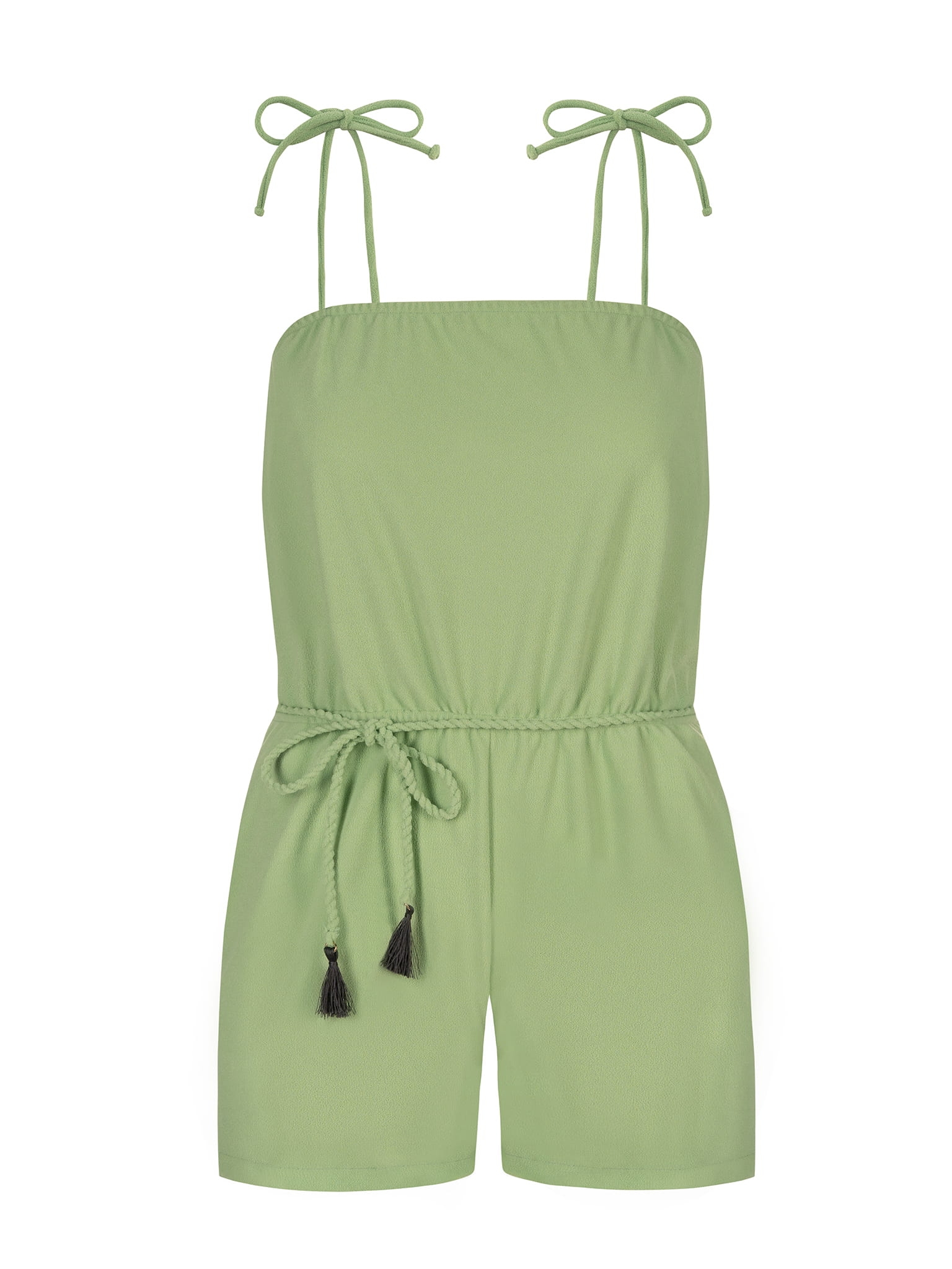 Dół kombinezonu to krótkie, luźne spodenki z kieszeniami, zakończone w połowie uda i połączone z górą elastyczną talią. Całość uzupełnia ozdobny pasek ze sznurka z chwostami, który podkreśla kobiecy styl i dodaje całości wakacyjnego charakteru.
