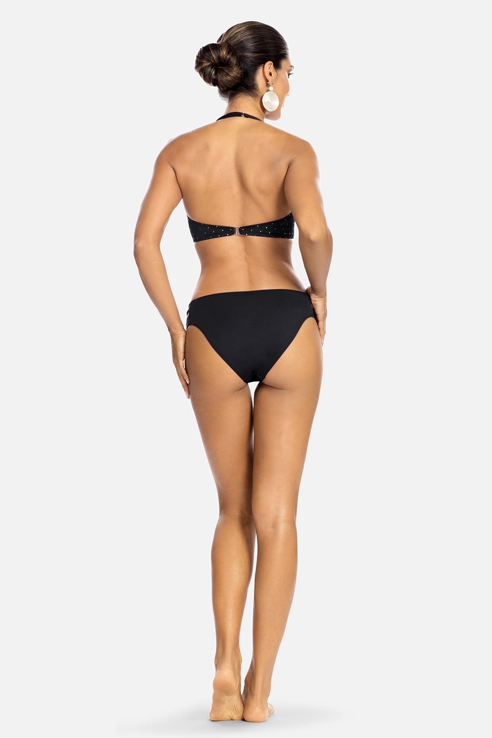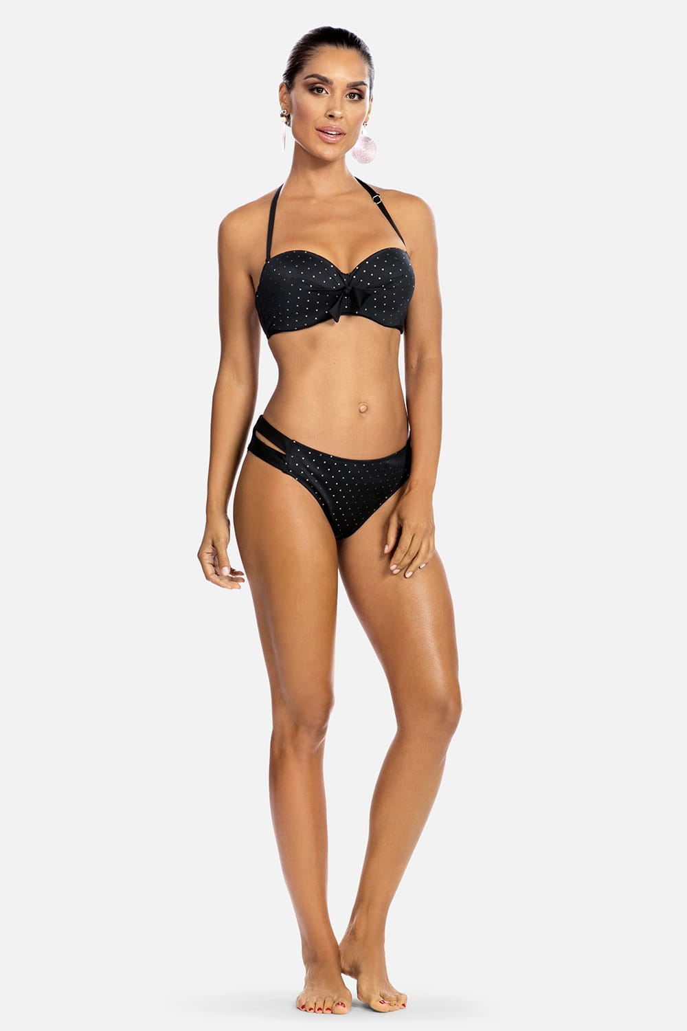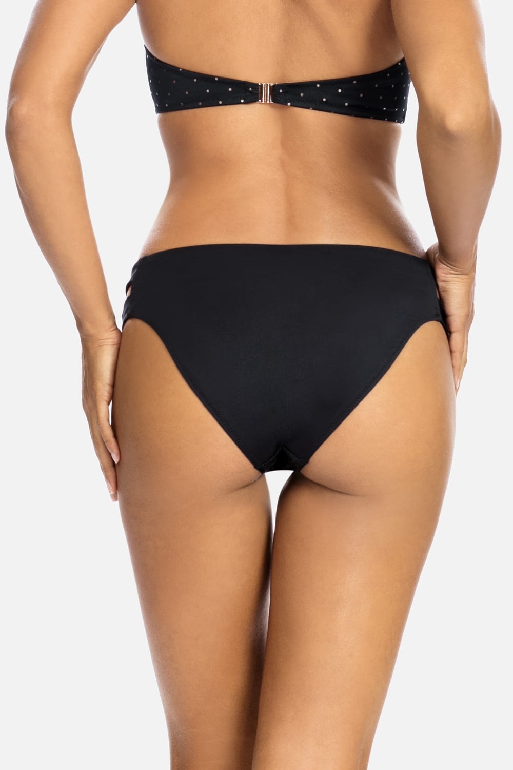 Słodkie i skromne, eleganckie i wyrafinowane, a może nawet trochę kokieteryjne - kostiumy kąpielowe w stylu retro charakteryzuje się ponadczasowym polotem. To właśnie różnorodność stylów sprawia, że stroje kąpielowe z kolekcji Glam Dots są tak atrakcyjne. Damskie figi kąpielowe o klasycznym, ponadczasowym, sprawdzonym kroju, który dopasowuje się idealnie do sylwetki. Przód od modelu majtek FD72a/812 wykonany jest z czarnego materiału w małe kropeczki w kolorze złotym, tył w całości czarny. Dół od kostiumu kąpielowego posiada delikatne wycięcia po obu bokach, które tworzą ciekawy element ozdobny. Produkt sprzedawany osobno, model majtek proponowany do góry kostiumu kąpielowego to FG72A/812. W kolekcji Glam Dots znajdziesz również inne modele majtek oraz biustonoszy, wiec z pewnością dopasujesz model do swojej sylwetki.