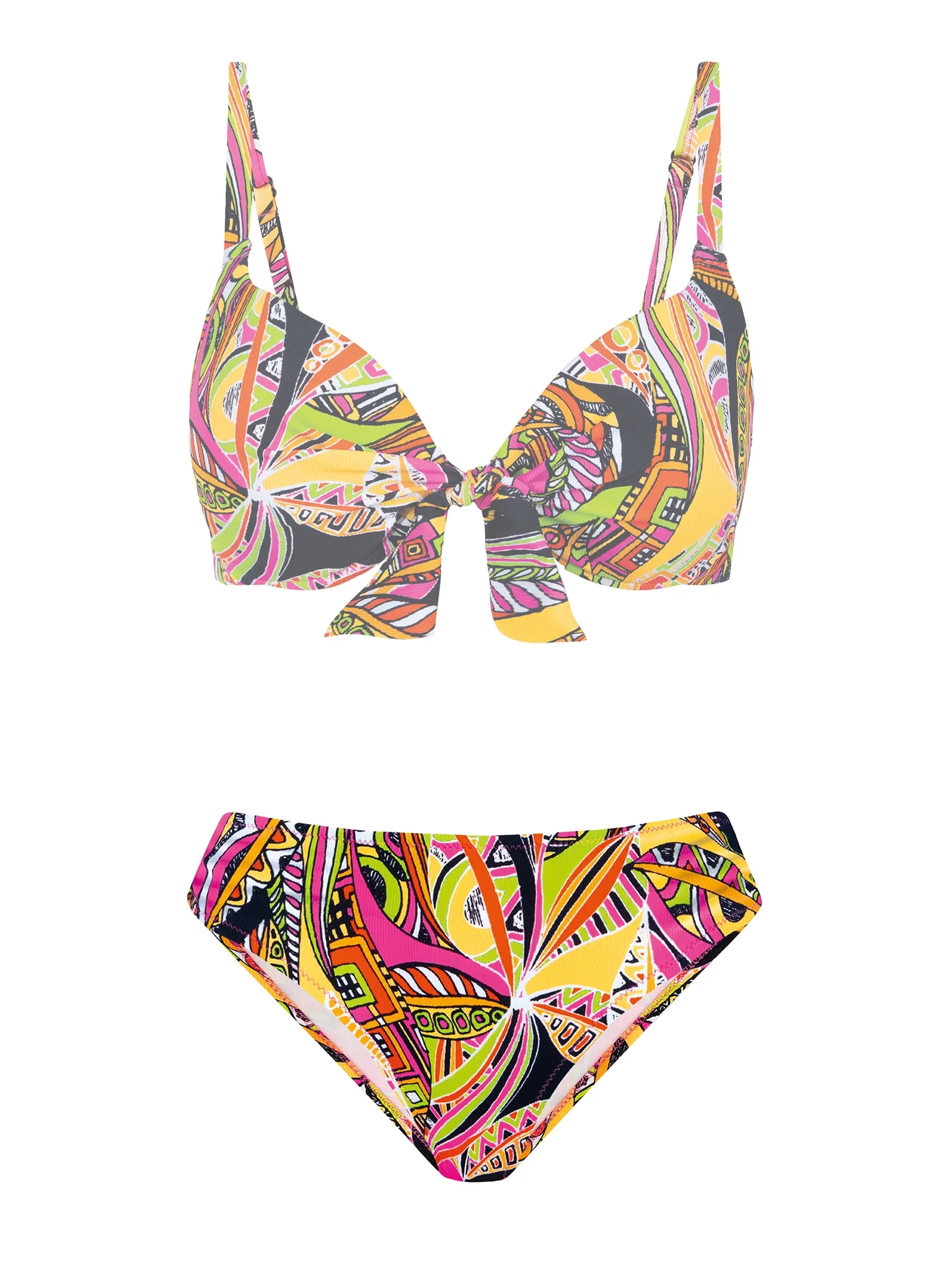 Figi kąpielowe FD21A/929P z linii Słoneczna Mozaika to propozycja dla kobiet, które kochają energetyczne, etniczne printy i komfort klasycznego kroju. Ten model przyciąga wzrok feerią barw: róż, limonka, pomarańcz, turkus i czerń tworzą geometryczno-roślinny wzór, inspirowany mozaiką i egzotyczną kulturą etno. Figi mają klasyczny fason z umiarkowanie wykrojonym tyłem i lekko obniżonym stanem - zapewniają idealne dopasowanie do sylwetki, nie rolują się i nie wpijają w ciało, gwarantując wygodę przez cały dzień. Delikatne marszczenia po bokach dodają subtelnego uroku, a żywe - neonowe kolory doskonale komponują się z opalenizną, tworząc letni look pełen energii i stylu.