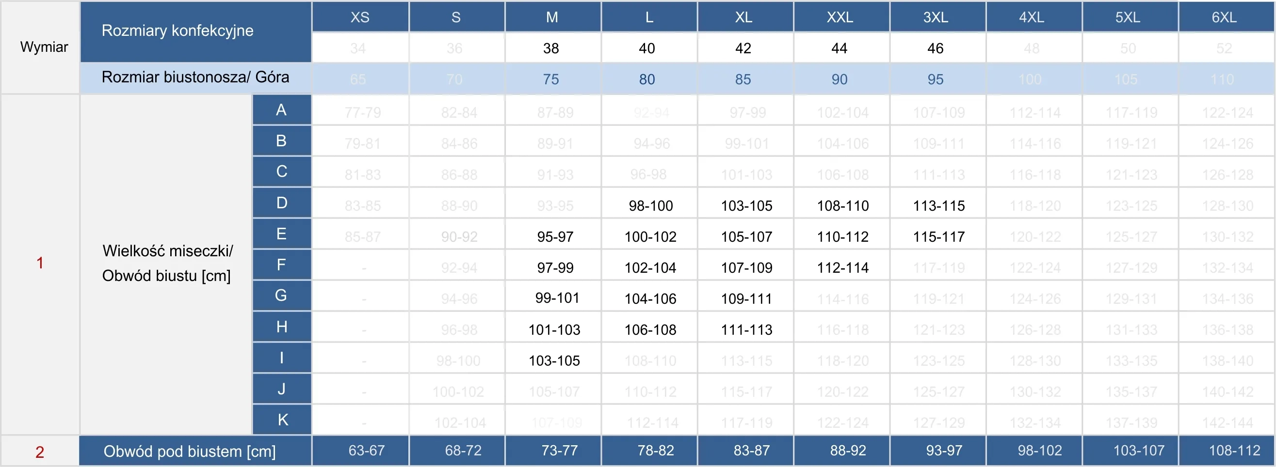 - Rozmiary: 38EFGHI, 40DEFGH, 42DEFGH, 44DEF, 46DE