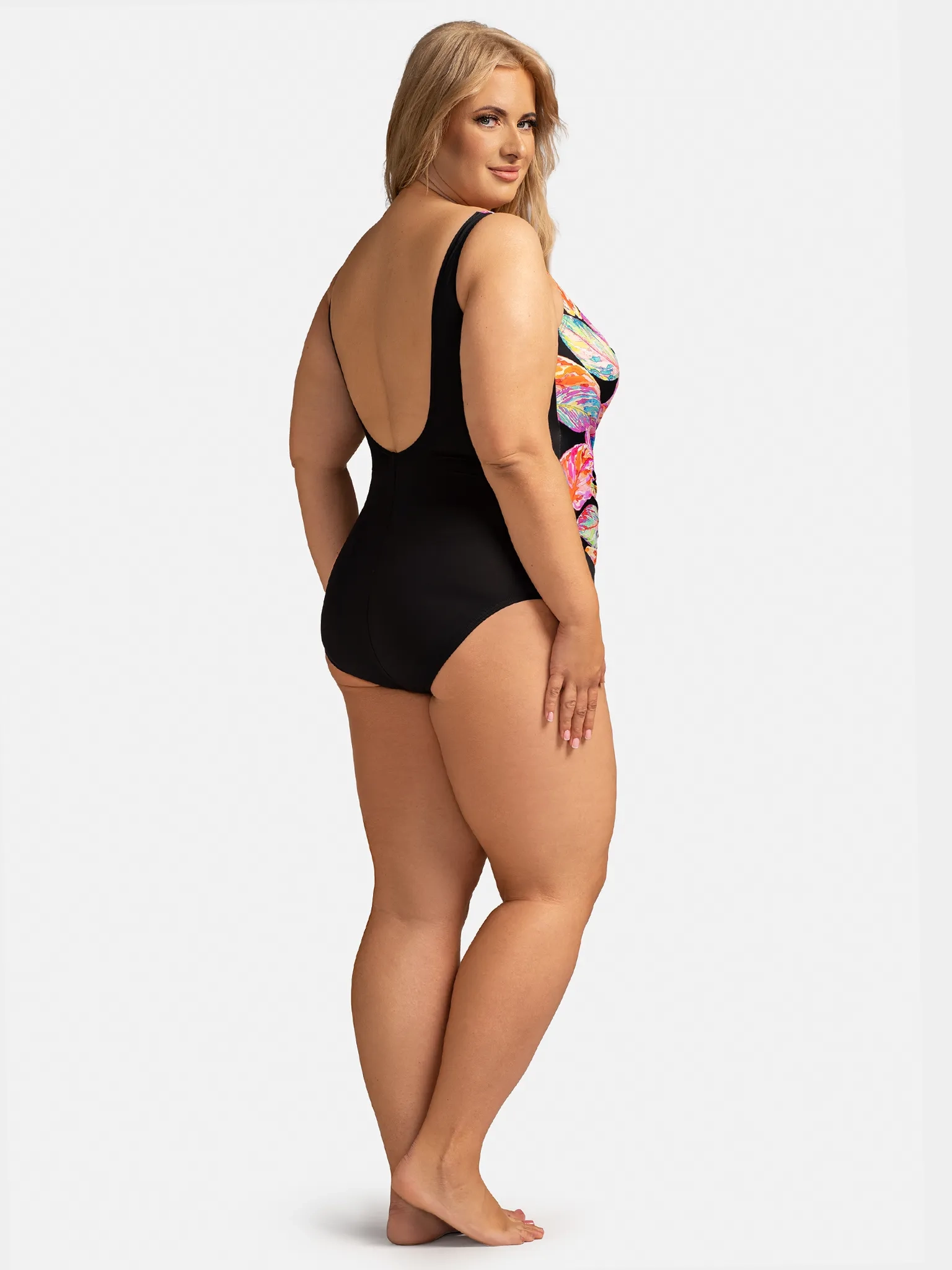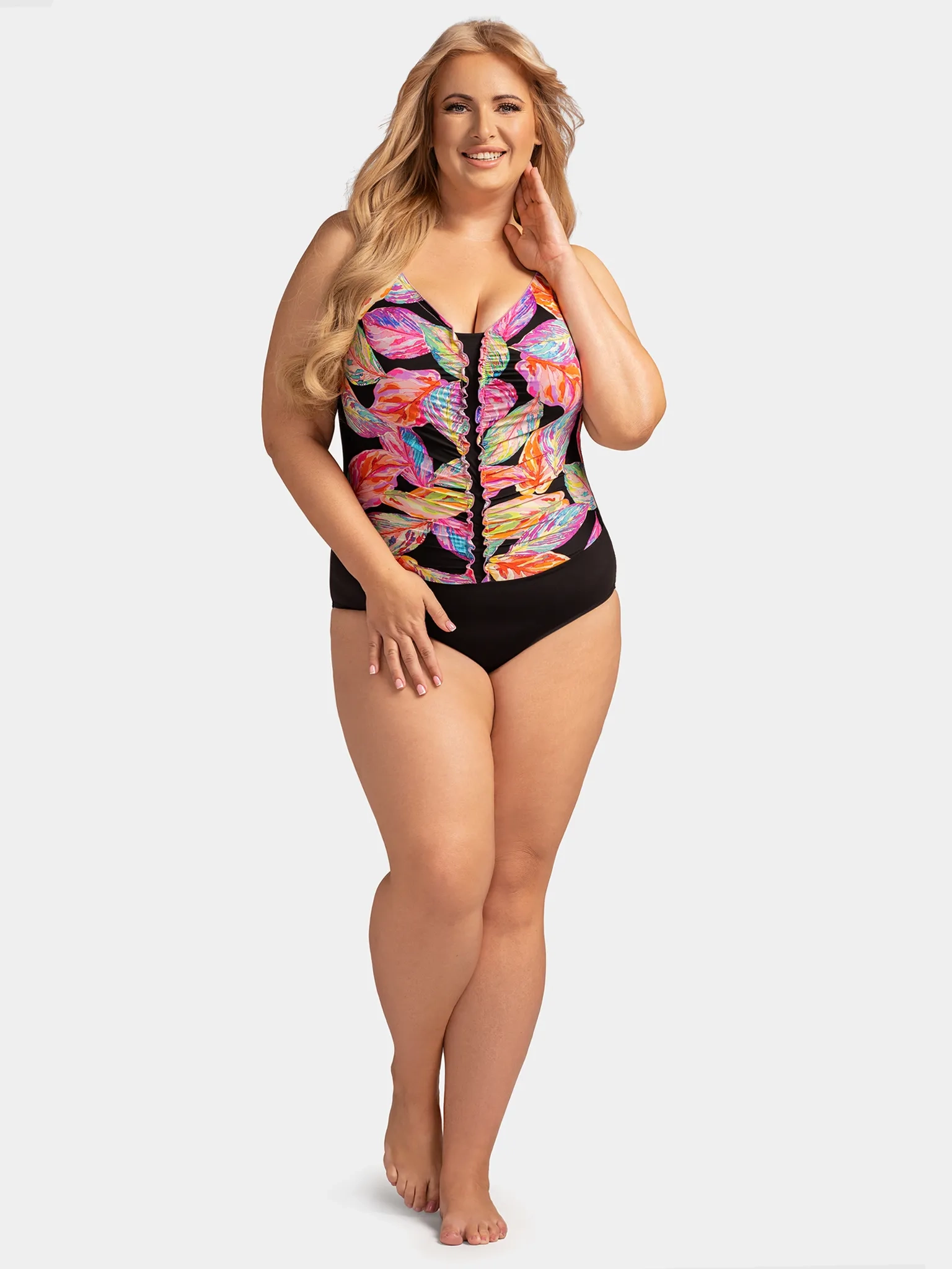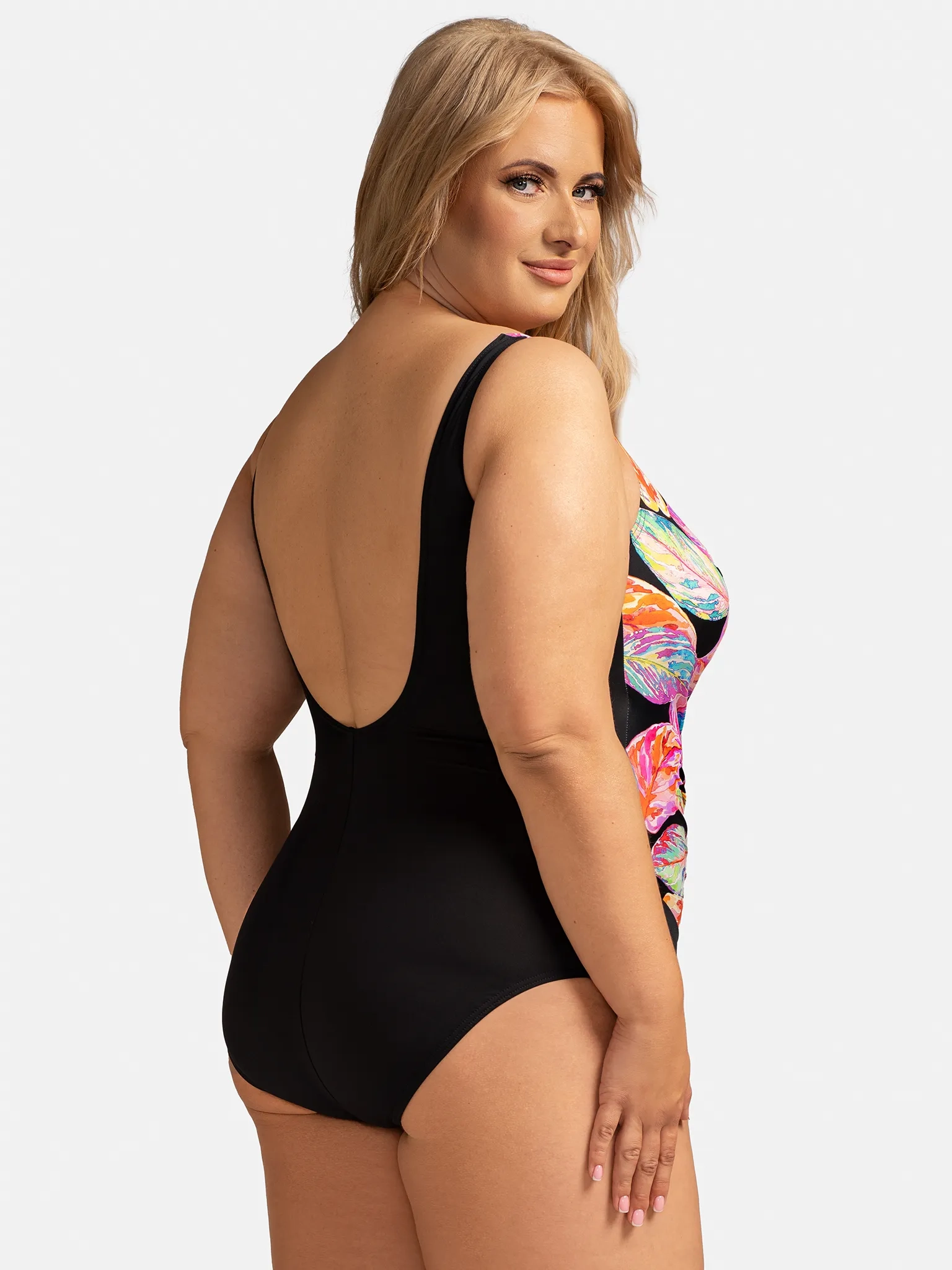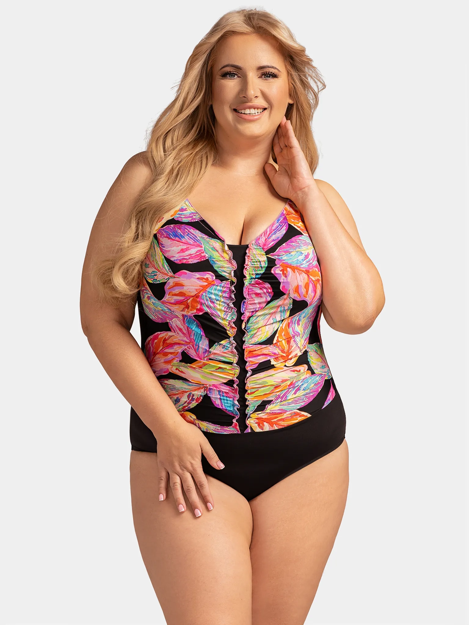 Fason ten został zaprojektowany również z myślą o kobietach, które szukają strojów kąpielowych plus size pragnących czuć się komfortowo i stylowo, niezależnie od rozmiaru. Neonowe liście na czarnym tle przywołują na myśl tropikalne ogrody, wprowadzając wakacyjny nastrój. Pionowe marszczenie na środku kostiumu działa wysmuklająco, modelując sylwetkę i maskując drobne niedoskonałości w okolicach brzucha. Szerokie ramiączka i podszycie gumą pod biustem zapewniają wygodę noszenia oraz stabilne podtrzymanie nawet przy większym biuście.