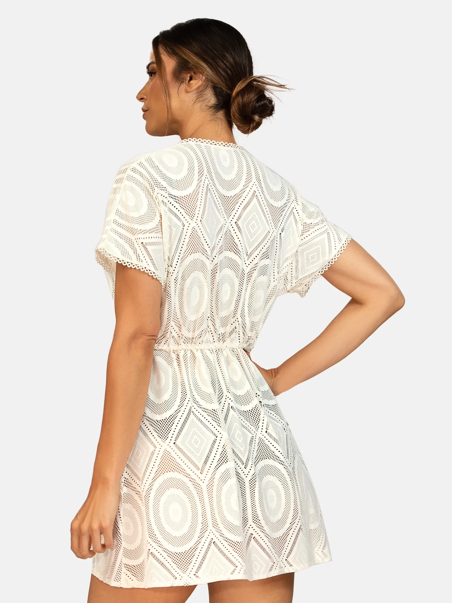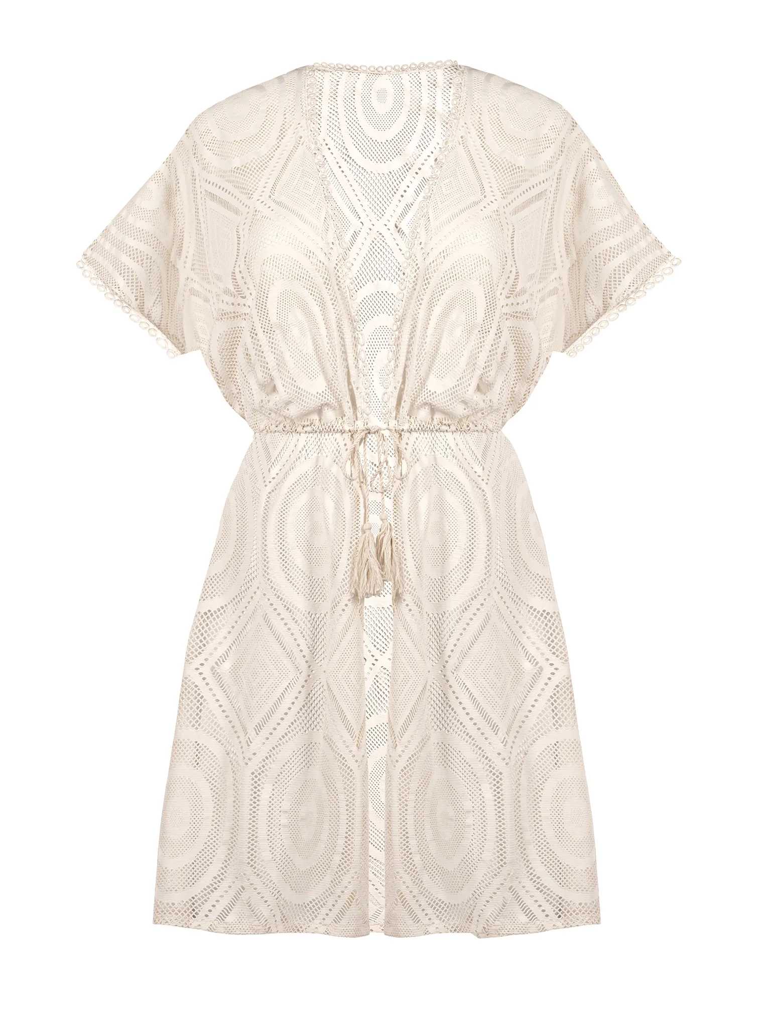 Model F218/641H to krótka sukienka plażowa o fasonie wiązanej tuniki. Luźny krój przed kolano miękko układa się na sylwetce, a sznurek w talii pozwala dopasować obwód i delikatnie podkreślić kształty. Krótki rękaw typu kimono zapewnia swobodę ruchów, a dekolt w kształcie litery V wysmukla szyję i dodaje kobiecego charakteru. Ażurowy, geometryczny wzór nawiązuje do stylu boho - lekkiego, swobodnego, inspirowanego naturą i ręcznie robionymi koronkami - dzięki czemu narzutka świetnie wygląda zarówno na plaży, jak i podczas spaceru po promenadzie czy w beach barze.