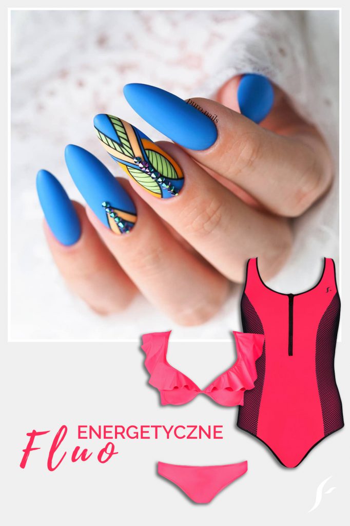 Jak wakacje, to neony! Co powiecie na wersję total look? Kostium kąpielowy w ostrym różu będzie wyglądał bajecznie w połączeniu z turkusowym czy chabrowym manicure. Nie poprzestajemy oczywiście tylko na kolorze. Urlop, to czas kiedy można zaszaleć i na chwilę zapomnieć o pracy, więc warto olśnić innych plażowiczów blaskiem cyrkonii koniecznie wkomponowanych w abstrakcyjne mazy. Sprawdźcie same, hasło #abstractnails ma na instagramie już ponad 57 tysięcy postów i zdjęć ciągle przybywa.