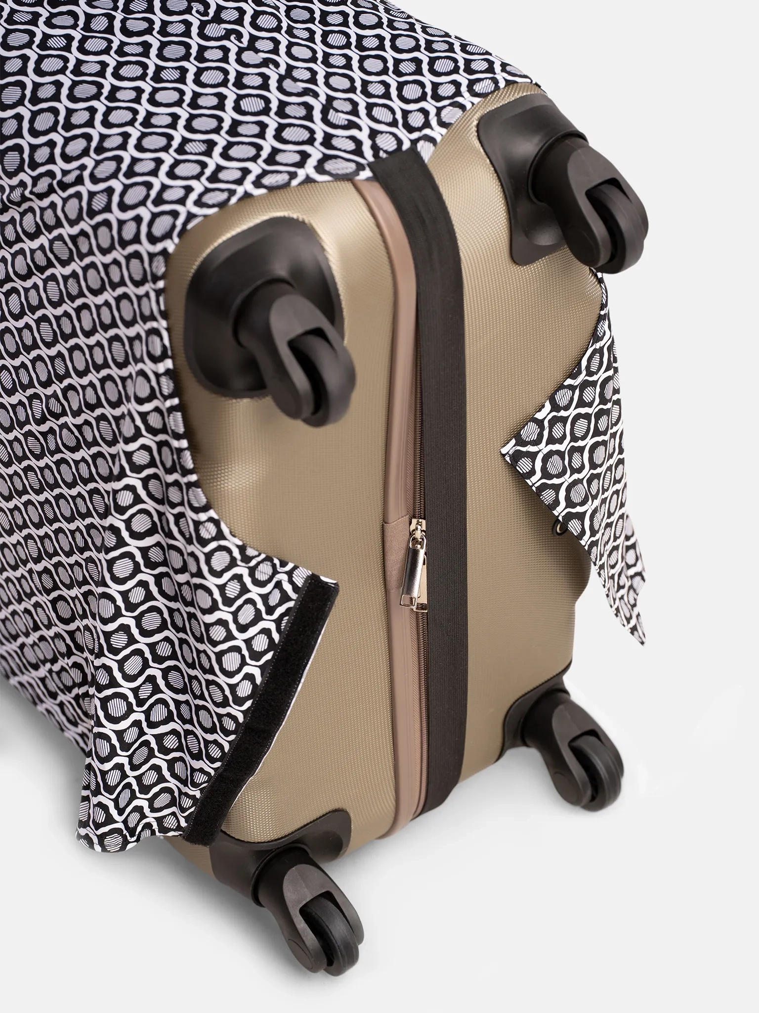 - elastyczna tkanina dopasowująca się do walizki i nieograniczająca pracy kółek