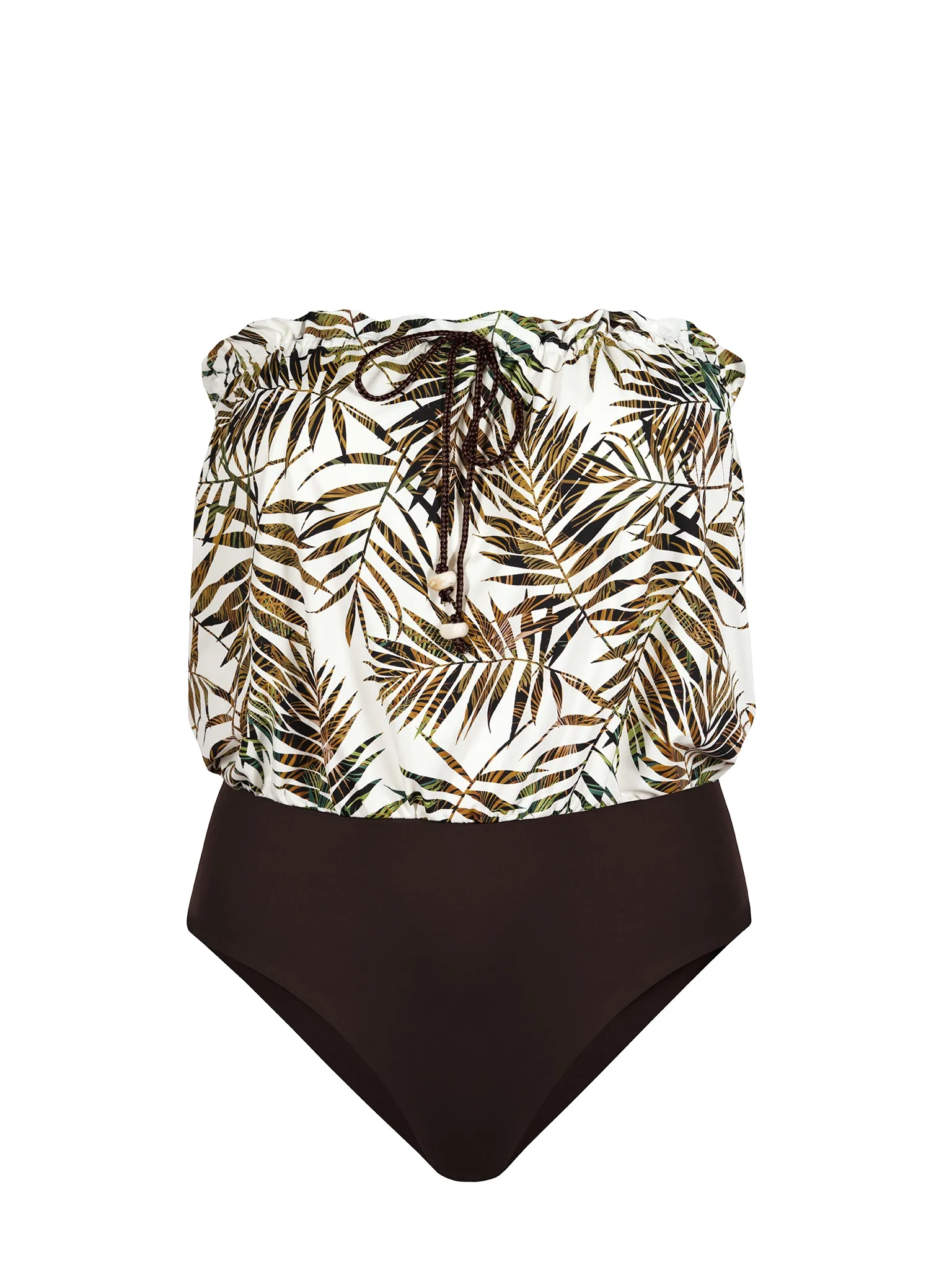 Ten jednoczęściowy strój kąpielowy ma luźną, bluzkową górę (tzw. blouson/bombka) połączoną z pełnymi majtkami. Góra nie przylega - miękko faluje nad brzuchem i bokami, maskując niedoskonałości. Przy dekolcie wszyto ściągany sznurek (regulacja obwodu) oraz delikatną falbankę, która dodaje dziewczęcego uroku. Z przodu subtelne wiązanie działa jak ozdoba. Model jest bez ramiączek i bez fiszbin - w części biustu od wewnątrz znajduje się podszewka z gumką pod biustem dla lekkiego podtrzymania. Dół w ciemnym, czekoladowym brązie kontrastuje z jasną górą i optycznie wysmukla dolne partie ciała. To krój wygodny do plażowania, morsowania i aktywnego dnia. Latem świetnie wygląda również jako body do jeansowych szortów.