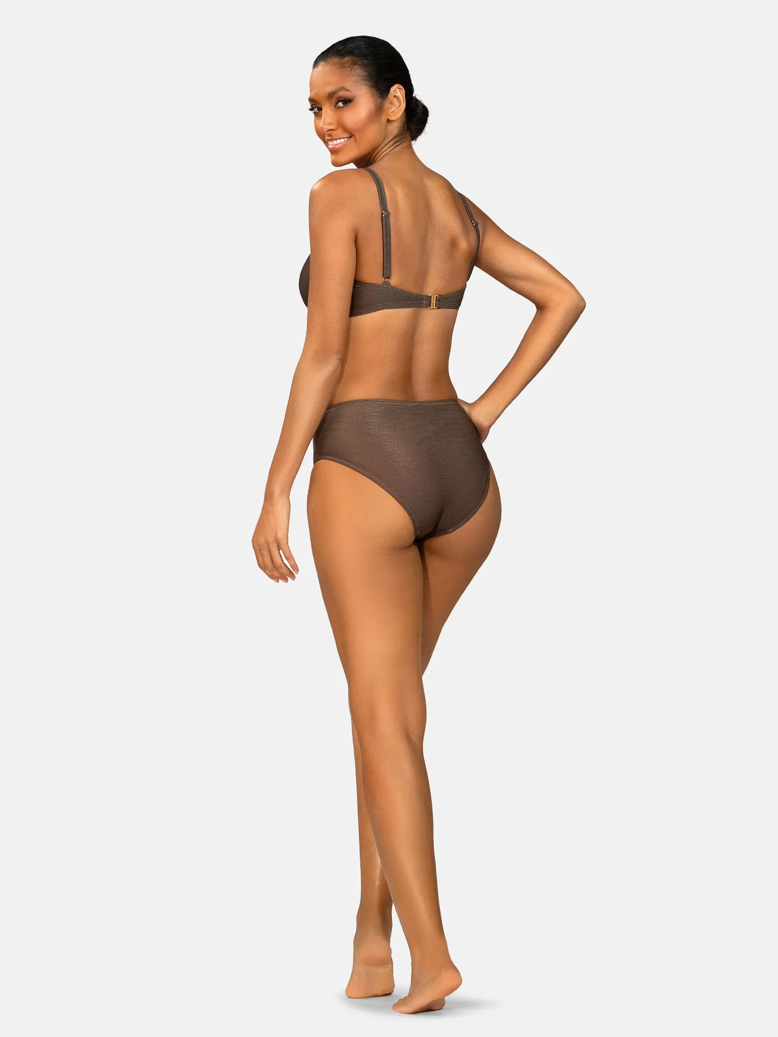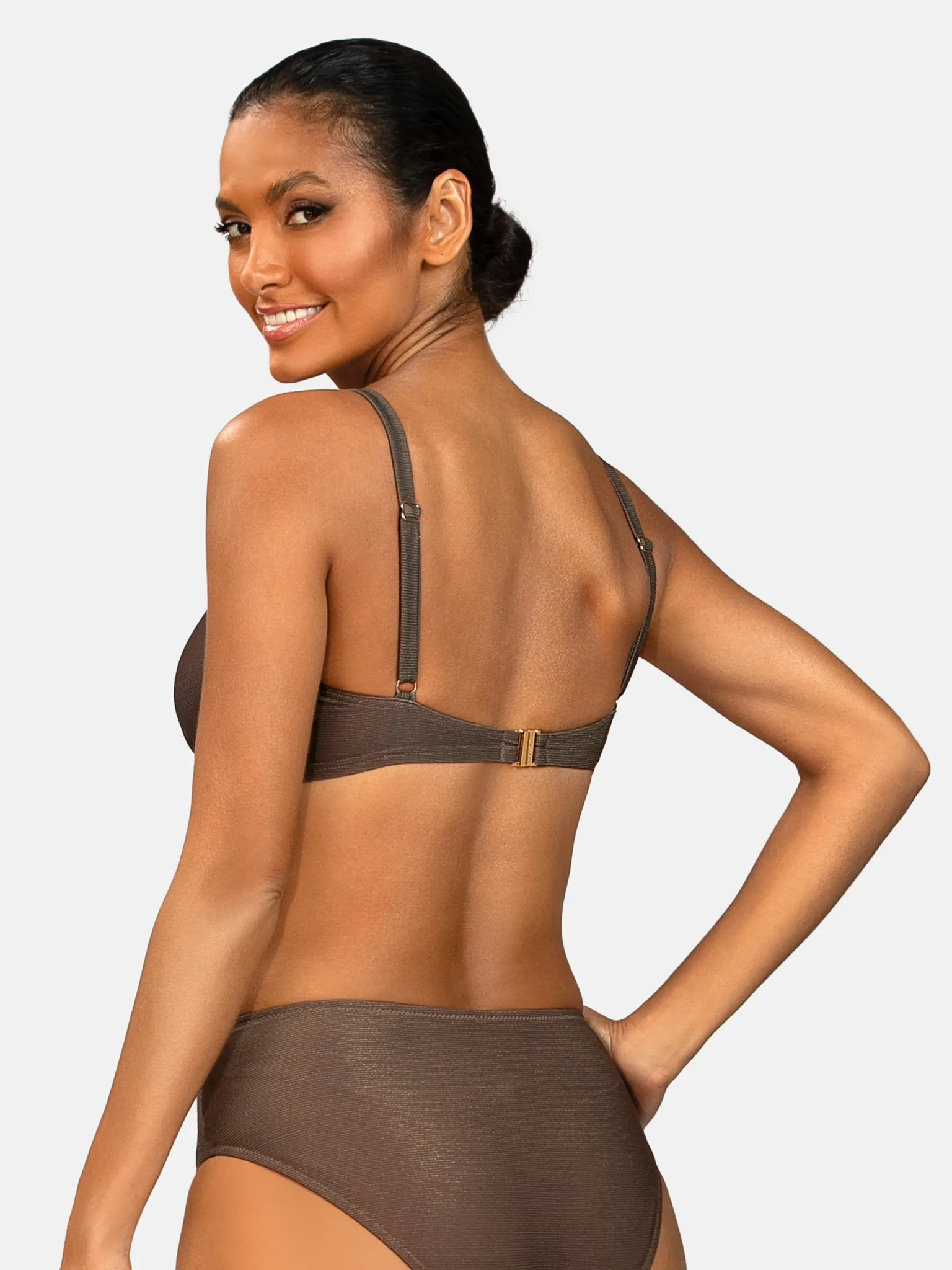 Biustonosz kąpielowy FG10/926 z linii Zielone Tropiki łączy elegancję gładkiego, kakaowego brązu z dyskretnym połyskiem złotej nitki. Ten szlachetny, czekoladowy odcień jest jednym z najmodniejszych kolorów sezonu - pięknie podbija opaleniznę, pasuje do różnych typów urody i świetnie wpisuje się w trend naturalnych, „ziemistych” barw w modzie plażowej. Delikatny metaliczny połysk sprawia, że w słońcu biustonosz mieni się subtelnie jak kameleon, nadając stylizacji luksusowego charakteru. Co więcej, jednokolorowe kostiumy kąpielowe stały się jednym z najsilniejszych trendów ostatnich sezonów - projektanci coraz częściej stawiają na głęboki, nasycony kolor zamiast wzorzystych printów, tworząc nowoczesny, elegancki i ponadczasowy look. Ten model idealnie wpisuje się w tę tendencję, oferując minimalistyczną formę podkreśloną wyjątkowym, modnym odcieniem.