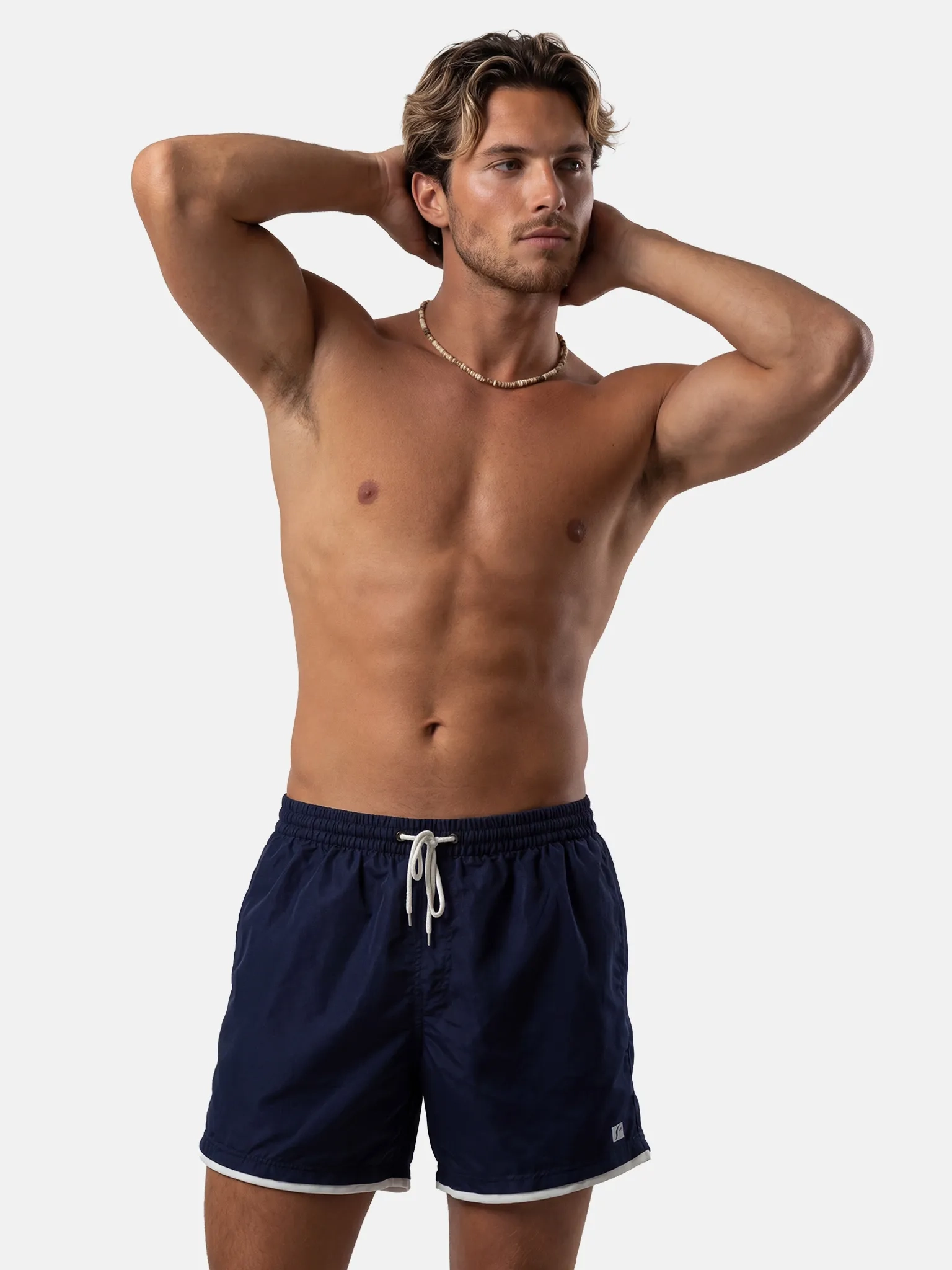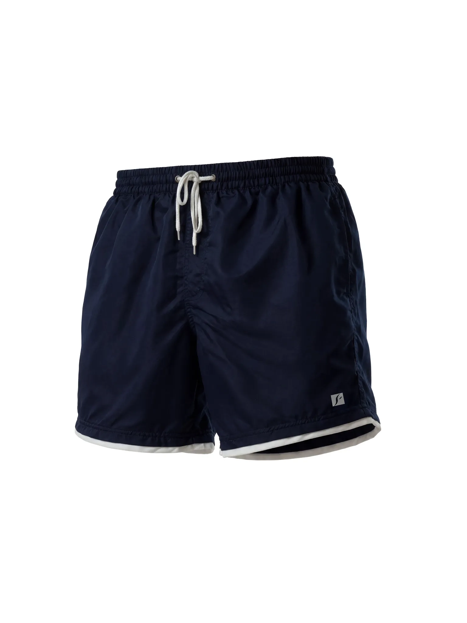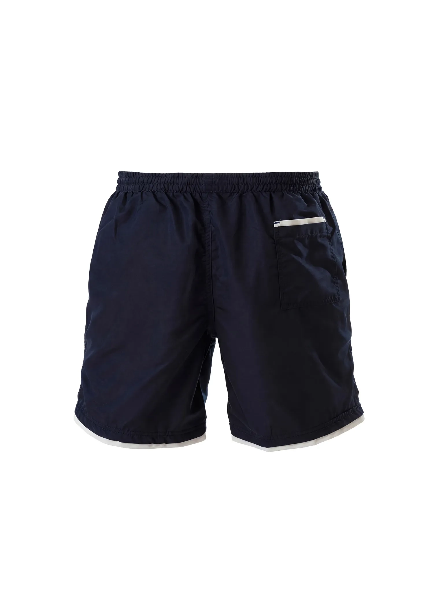 Granatowa baza i sportowe, białe akcenty dają nowoczesny efekt. Funkcjonalny krój i siateczkowa podszewka dbają o komfort przez cały dzień. To szorty, które równie dobrze wyglądają na plaży, jak i w drodze po kawę na deptaku.