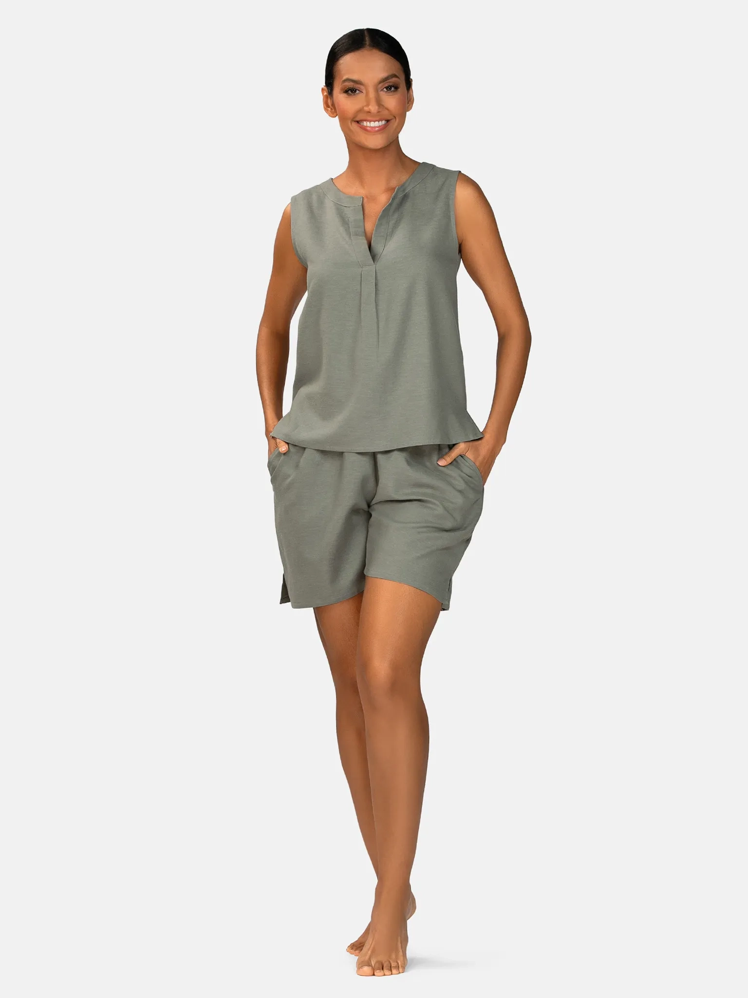Wygodne szorty damskie na lato F251/857 z linii Lniany Szept Natury powstały z myślą o kobietach, które w ciepłe dni stawiają na naturalne tkaniny i swobodę ruchów. Jasny odcień khaki - inspirowany kolorami ziemi - jest praktyczny, twarzowy i świetnie podkreśla opaleniznę, jednocześnie łatwo łączy się z bielą, beżem, czernią czy mocniejszymi akcentami kolorystycznymi. Mieszanka bawełny, lnu i wiskozy sprawia, że materiał jest przewiewny, „oddycha” i nie klei się do ciała, dzięki czemu szorty sprawdzą się zarówno na plaży, jak i w mieście czy w podróży.