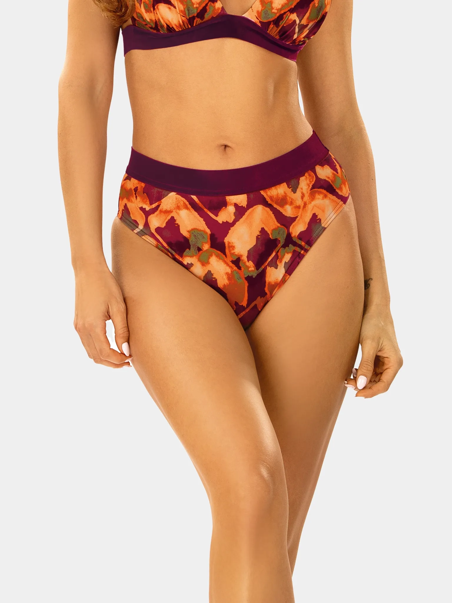 Figi taliowane/shape/push up z kolekcji Burning Elegance wyróżniają się wyjątkowym ognistym wzorem w odcieniach czerwieni, bordo i pomarańczu, który dodaje letniej energii i elegancji. Model ten zapewnia wyjątkowy komfort oraz nowoczesny design, który idealnie sprawdzi się podczas letnich dni nad wodą. Bordowe figi z wysokim stanem to fason to jeden z najmodniejszych krojów sezonu, zaprojektowany z myślą o każdej sylwetce – dodaje pewności siebie i zapewnia maksymalny komfort noszenia. Wysoki stan fig nie tylko doskonale wymodeluje okolice brzucha, ale również ukryje drobne niedoskonałości, zapewniając efekt idealnie wysmuklonej sylwetki.