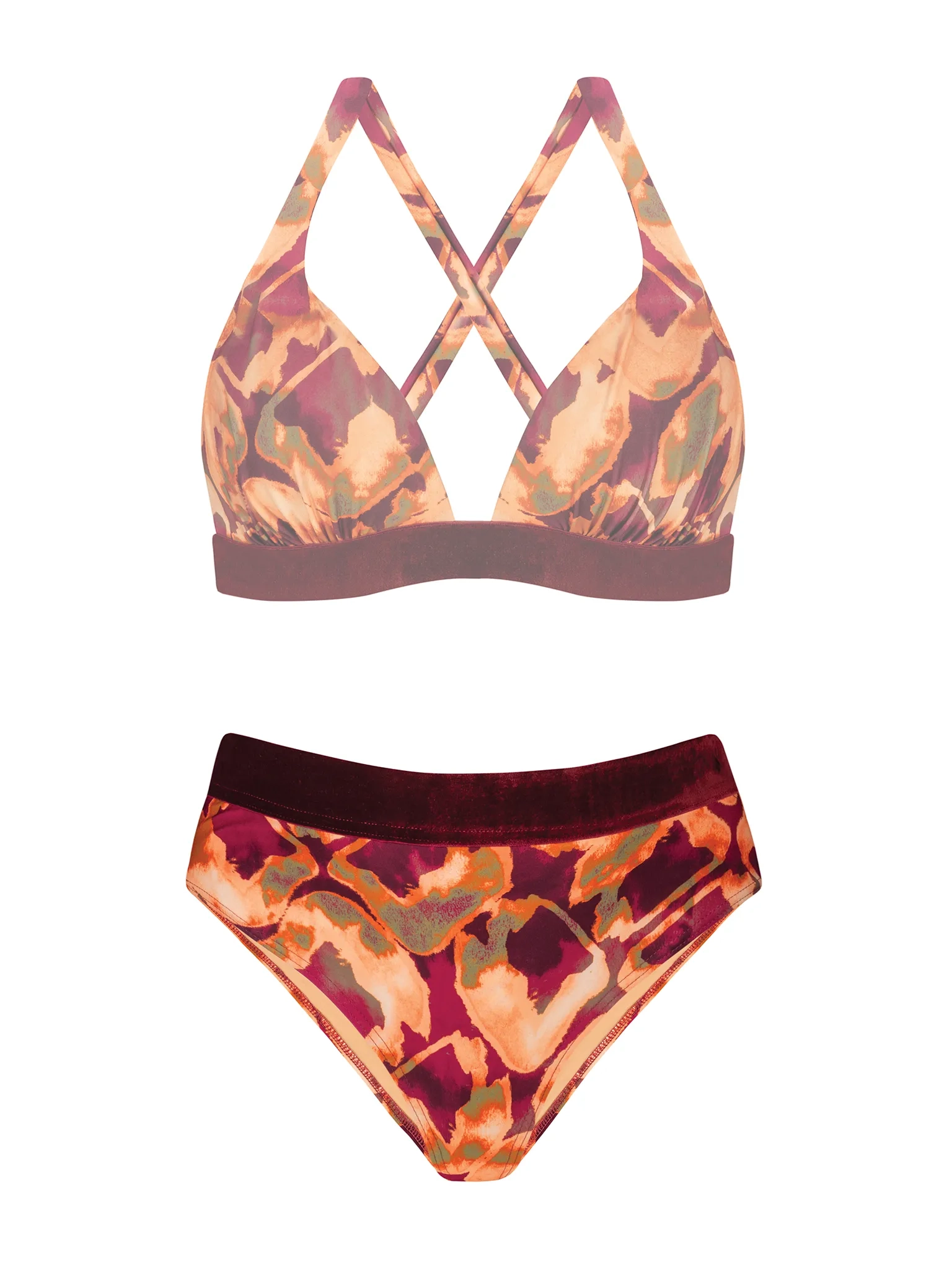 Linia Burning Elegance to zaproszenie do stworzenia stylizacji pełnej charakteru i wyrazistego stylu. Bordowe figi kąpielowe z wysokim stanem FD161/909 doskonale komponują się z innymi elementami kolekcji, takimi jak biustonosze kąpielowe, tunika czy spódnica plażowa, tworząc całościowy, unikatowy look. Aby zobaczyć dostępne produkty w tym princie, wpisz w naszą wyszukiwarkę nr 909 lub 910.