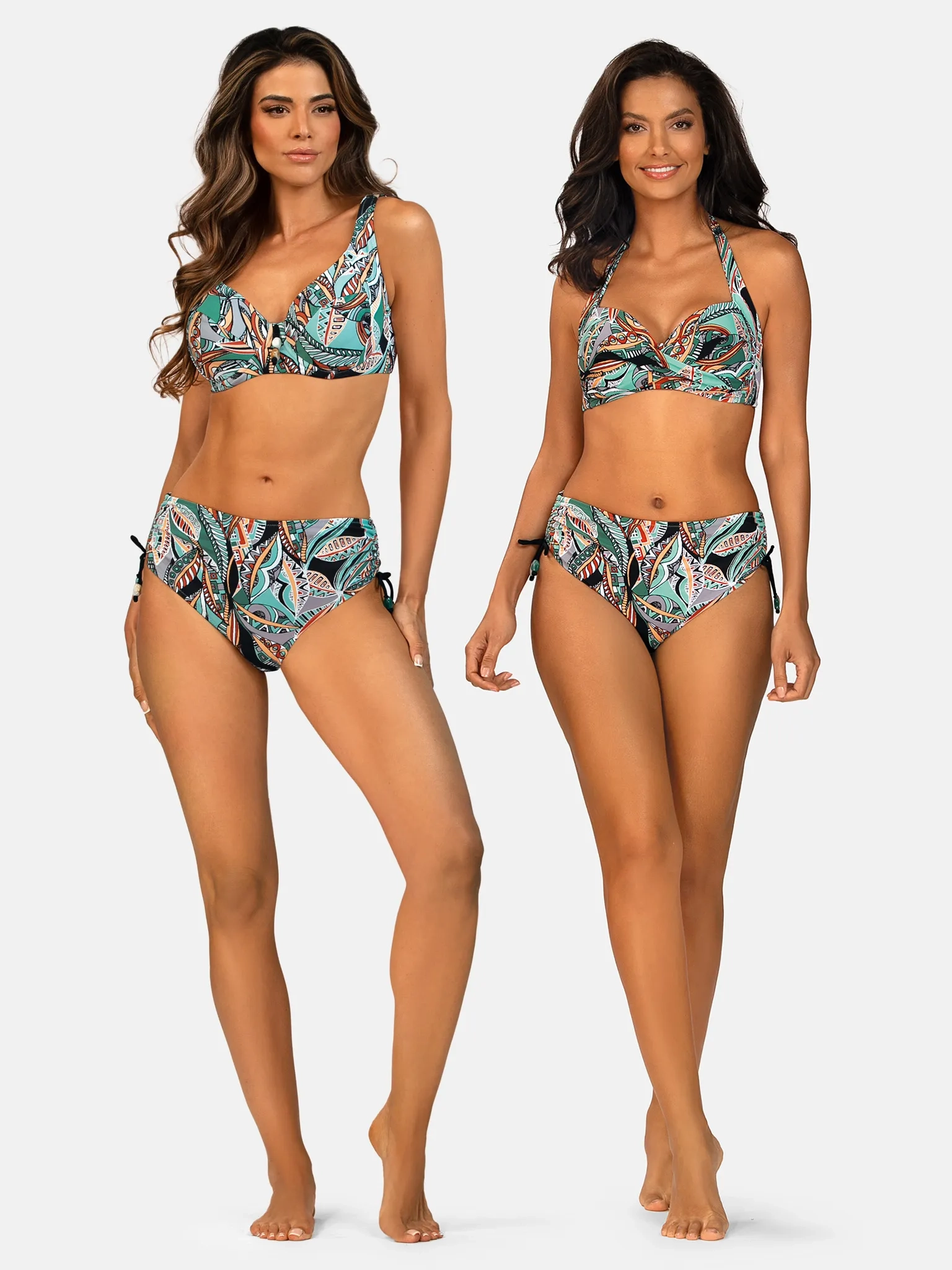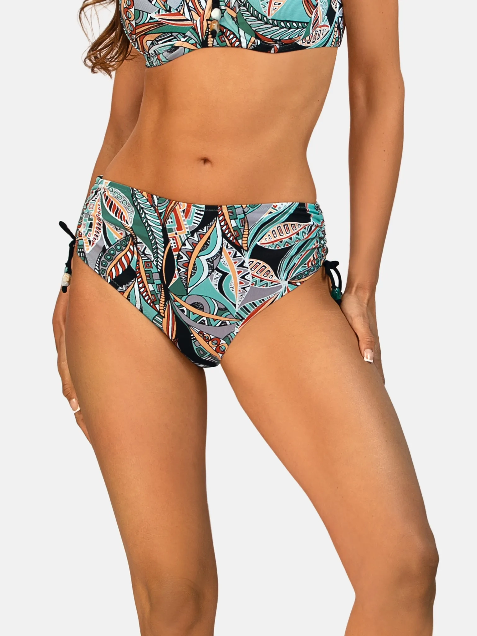 - uniwersalny, etno-geometryczny design - kolorowa mozaika mięty, turkusu, beżu i czerni pasuje do różnych typów sylwetek i łatwo łączy się z biustonoszami oraz dodatkami plażowymi z kolekcji Mozaika Natury